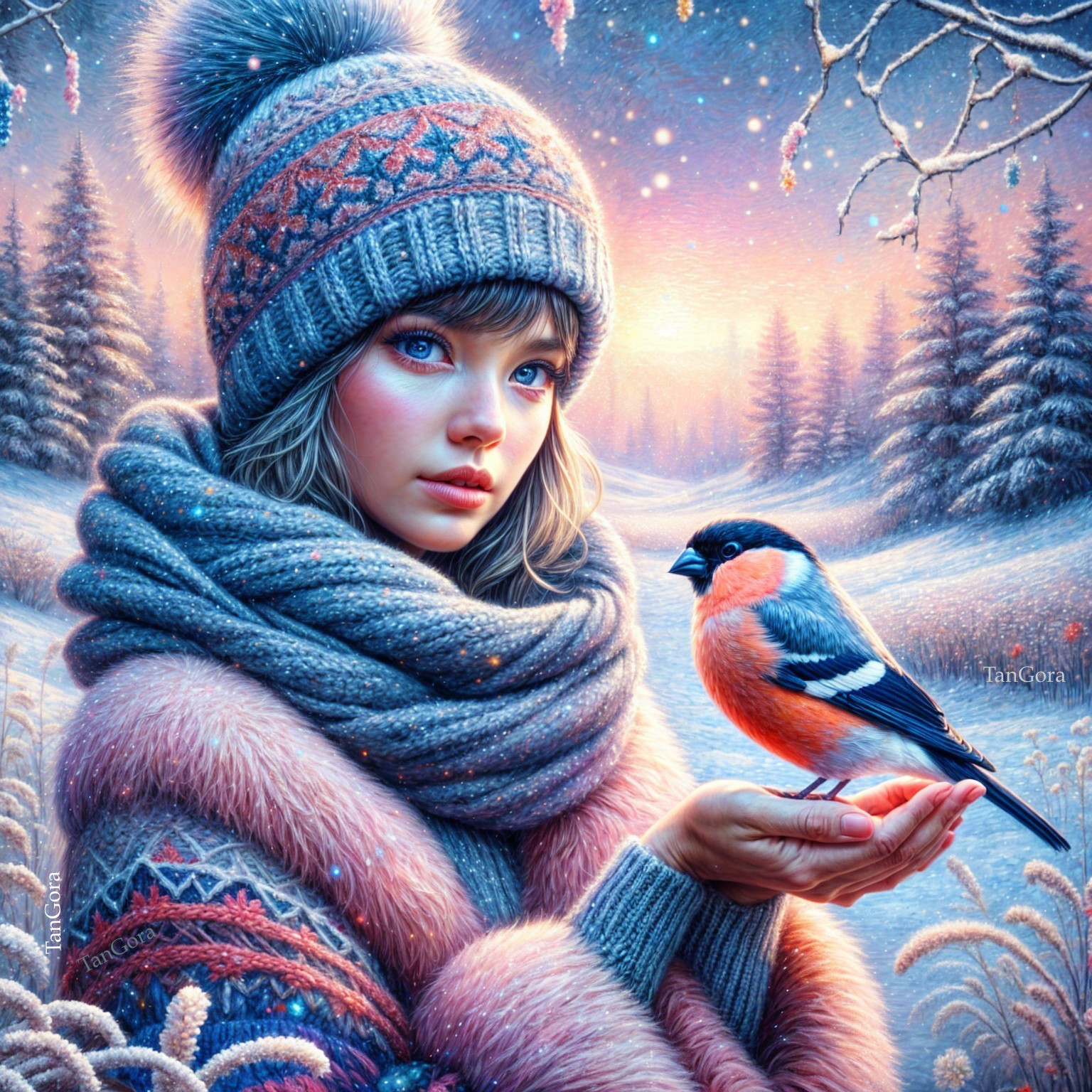 A young woman in a cozy, knitted hat and scarf holds a vibrant orange and black bird in a snowy landscape, surrounded by frosty trees and a dreamy, colorful sky at dusk.
