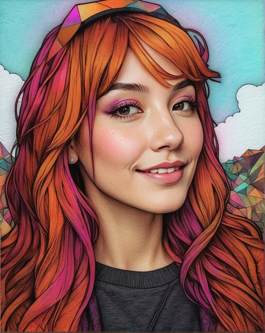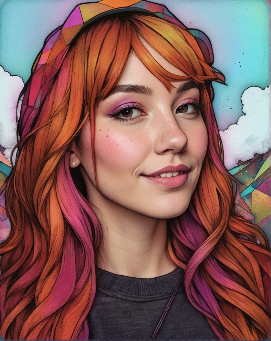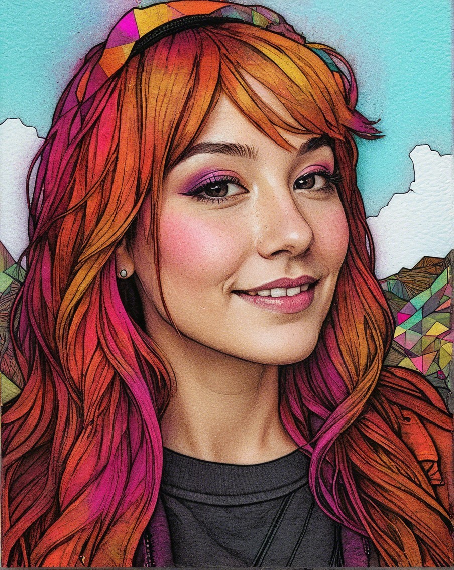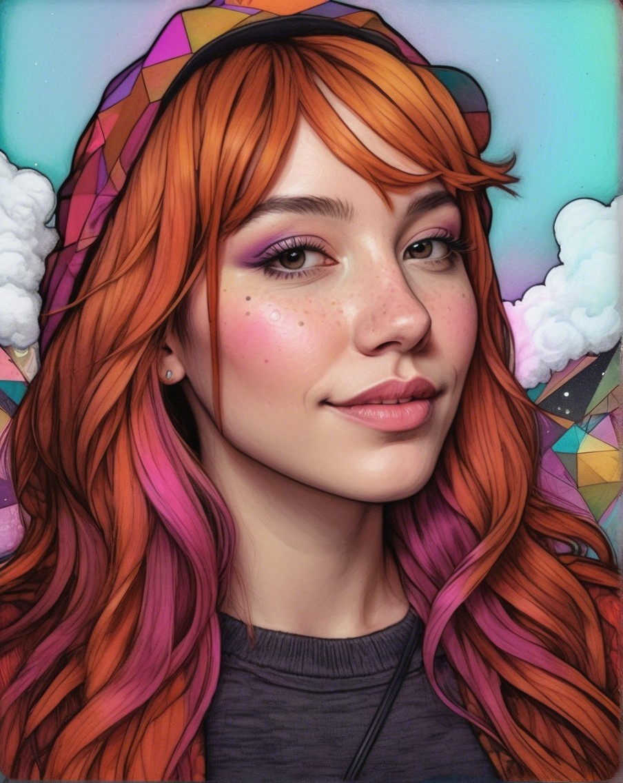 + Prompt:Scruffy portraiture with geometrical styles with elements of foampunk, detailed line art to create a whimsical and psychedelic ambiance, indiecore with hatching details and a soft, rounded, color glitch, queer, weathered and aged feel, ethereal atmosphere, fantasy elements, precise execution. Stacked lines with Colored ink by Stan Lee and Ho Baron, triadic color scheme orange-red sea-green black in estranged colors, psychedelic Woodblock Print: gothic rock woman stylized woodblock print by Ed Binkley, plasticity 1.2, Arcane GTNR style, custom_loss: edge, parallax occlusion, plasticity 1.7, complexion 1.1, only curves, zentangle method, dynamic lighting 1.7, VFX-inspired softened lighting, bright, soft yellow and red tones, stylized and highly detailed, intricate and fluid swirling, subsurface scattering, elegant, artstation, 16K octane render, volumetric light, colorful ambient occlusion, colorful ray tracing, coloring by Georgia O'Keeffe, intricate portrait features, balanced coloring, very smooth american gothic & precise Gelsculpt 64K, divisionism, quilling, delicate coloring 1.3, sculpted, cel-shaded optical illusion with paint drops Illusion of depth. Gravitational 3D effects, cottagecore style by Horace Pippin and Earl Moran, rule of thirds, 1970's vintage cartoon, linework rim lighting, otherworldly with inkpunked hues by Overton Loyd and Brad Kunkle, dynamic lighting and casted shadows for depth, parallax occlusion enhances the three-dimensional effect, fusion of geometrical styles with elements of foampunk. Whimsical abstract surreal scene, slightly sculpted, negative lucas numbers, ambient occlusion 1.3, parallax occlusion 1.3, raytraced shadows 1.3, dynamic lighting and casted shadows for depth, while parallax occlusion enhances the three-dimensional effect,