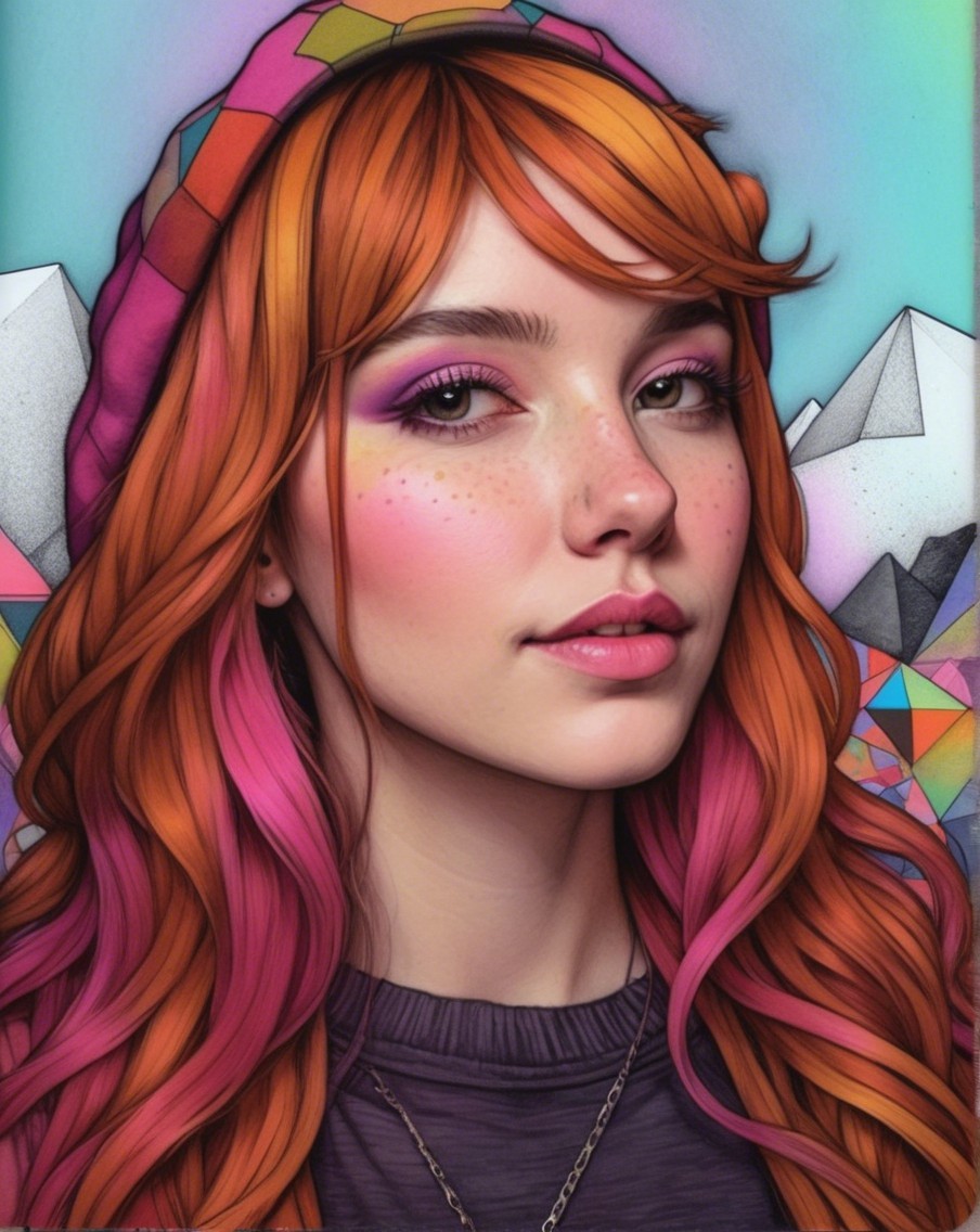 The image features a young woman with vibrant orange and pink hair, wearing a stylish beanie and a cozy sweater. Her striking makeup accentuates her features against a colorful geometric background.