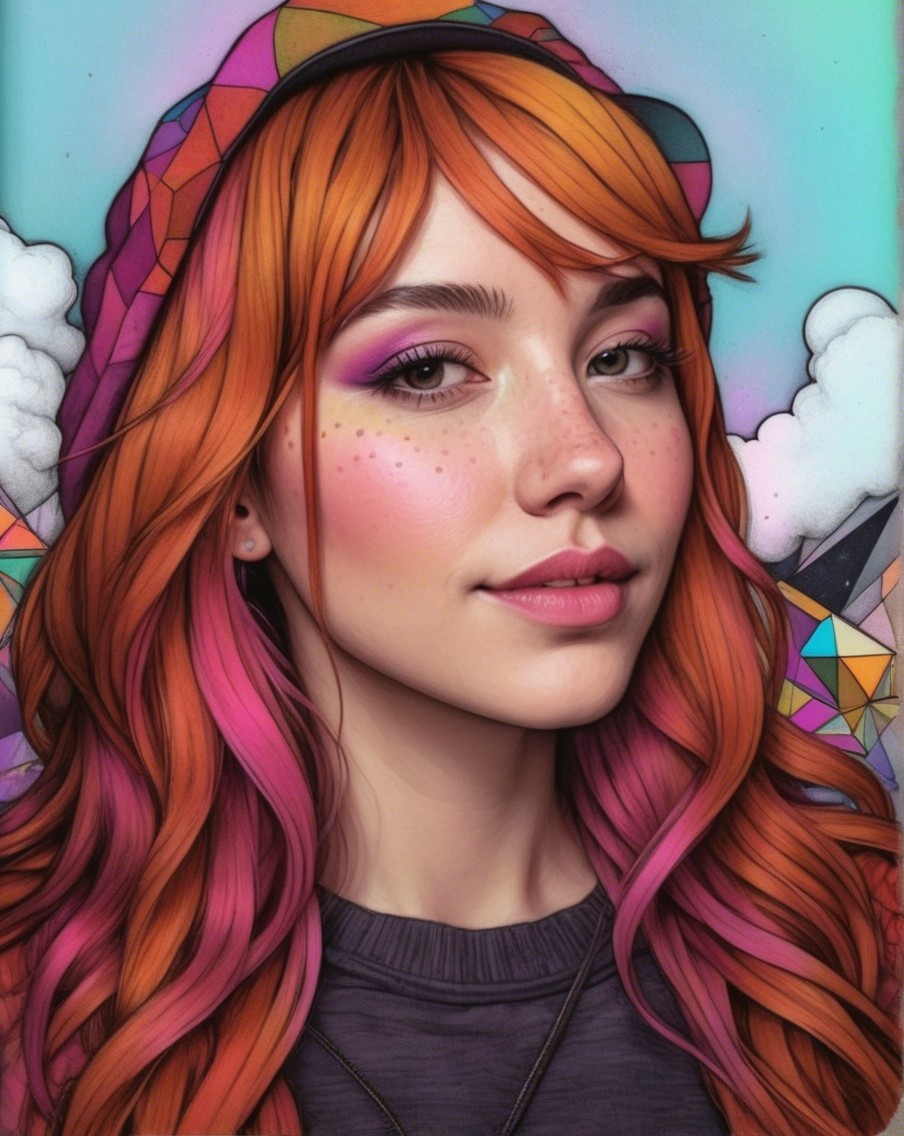Prompt: Scruffy portraiture with geometrical styles, intricate elements of foampunk, sketch book art, pen and ink, fluffy hat with crackles, indiecore, detailed line art, whimsical and psychedelic ambiance, indiecore with hatching details, soft color glitch, queer, weathered and aged feel, ethereal atmosphere, fantasy elements, precise execution. Stacked lines with Colored ink by Stan Lee and Ho Baron, triadic color scheme orange-red sea-green black in estranged colors, psychedelic Woodblock Print: gothic rock woman, only curves, stylized woodblock print by Ed Binkley, plasticity 1.2, Debeh, dof, bokeh effects, vfx-inspired layered hues, oil blend technique, complex airbrush overspray, layered, dyed, calm, intricate dark fantasy elements, tonalism influence, soft line-art details, plasticity 1.3, bloom-effect, raytraced shadows for depth, micro-pen lines for precision, splash ink technique reminiscent of Marc Allante, warm earth tones with colorful yam accents, psychedelic psychopomp theme, subsurface scattering for a unique touch, minimalistic composition, lighting by Ho Baron, detailed paper fibers, triadic color scheme beige auburn dark-yellow, captivating and detailed artwork by Renny Tait and Hugo Pratt. Hues by Man Ray, subsurface scattering 1.3, raytraced shadows, parallax occlusion, brightness 1.3, polished delicate coloring 1.3, sculpted, cel-shaded optical illusion with paint drops Illusion of depth. Gravitational 3D effects, cottagecore style by Horace Pippin and Earl Moran, rule of thirds, 1970's vintage cartoon, linework rim lighting, otherworldly with inkpunked hues by Overton Loyd and Brad Kunkle, dynamic lighting and casted shadows for depth, parallax occlusion enhances the three-dimensional effect, fusion of geometrical styles with elements of foampunk. Whimsical abstract surreal scene, slightly sculpted, negative lucas numbers, ambient occlusion 1.3, parallax occlusion 1.3, raytraced shadows 1.3, dynamic lighting and casted shadows for depth, while parallax occlusion enhances the three-dimensional effect,