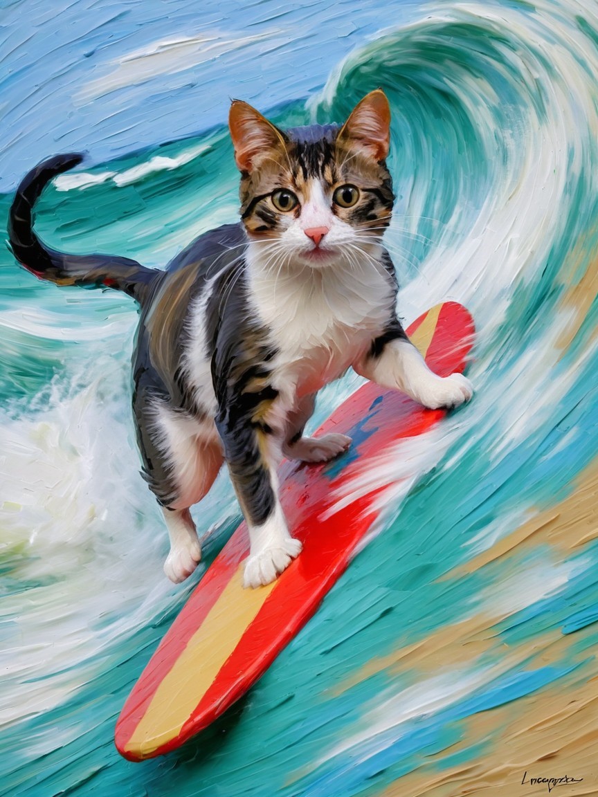 A detailed, high-angle, eye-level, full body illustration of a cute young calico cat facing the viewer, actively surfing on a red and yellow surfboard on a massive wave, rendered in a thick impasto oil painting style. The cat has a striking calico pattern, with dark brown