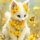 A whimsical scene featuring a fluffy white cat adorned with yellow flowers. Its enchanting green eyes gaze at a delicate butterfly nearby, set against a soft, dreamy floral backdrop.