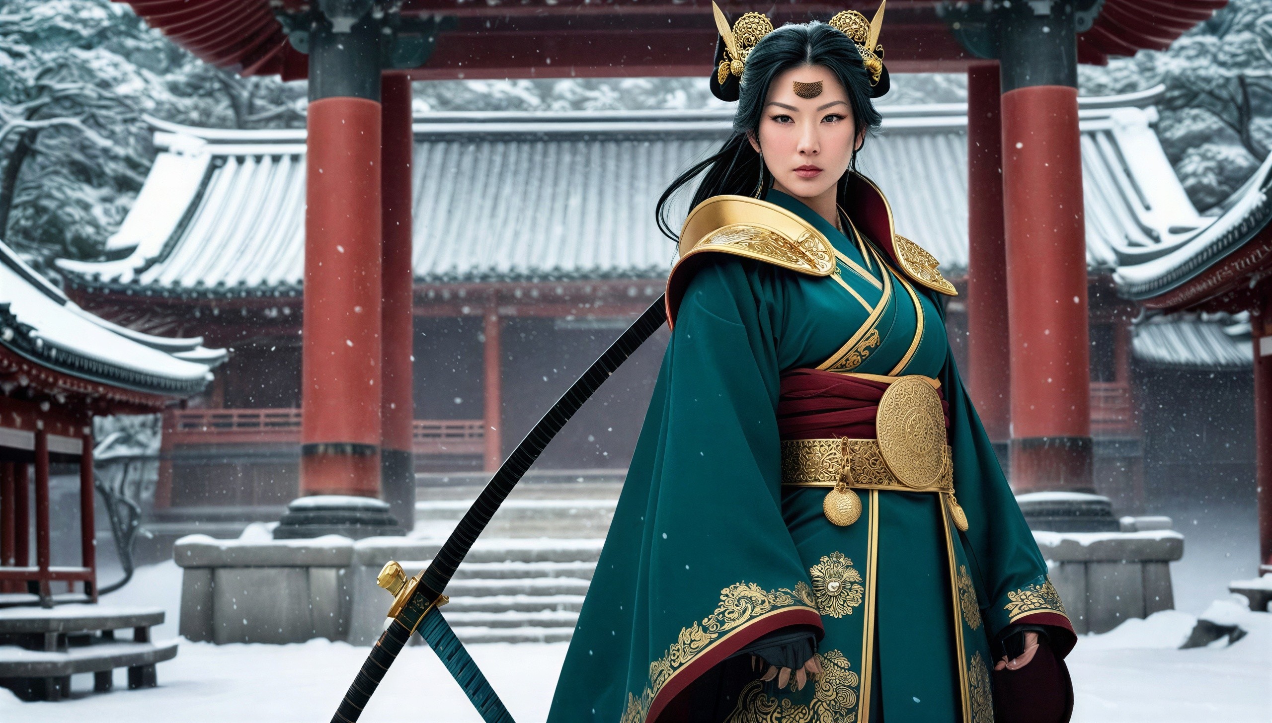 A beautiful fierce Asian warrior woman stands confidently in the snowy courtyard of a traditional Japanese temple. She is dressed in an ornate deep green robe with exquisite gold embroidery, and her black hair is adorned with golden accessories. A katana sword is discreetly placed beside her, its hilt visible. The temple features