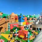 A vibrant, whimsical amusement park scene filled with colorful structures, balloons, and playful characters. Families enjoy the attractions around a central water pool, under a bright blue sky.