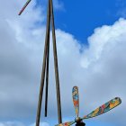 A vibrant landscape featuring a cozy house surrounded by colorful trees, rolling hills, and swirling clouds. Two large, artistic wind turbines stand majestically against a bright blue sky.