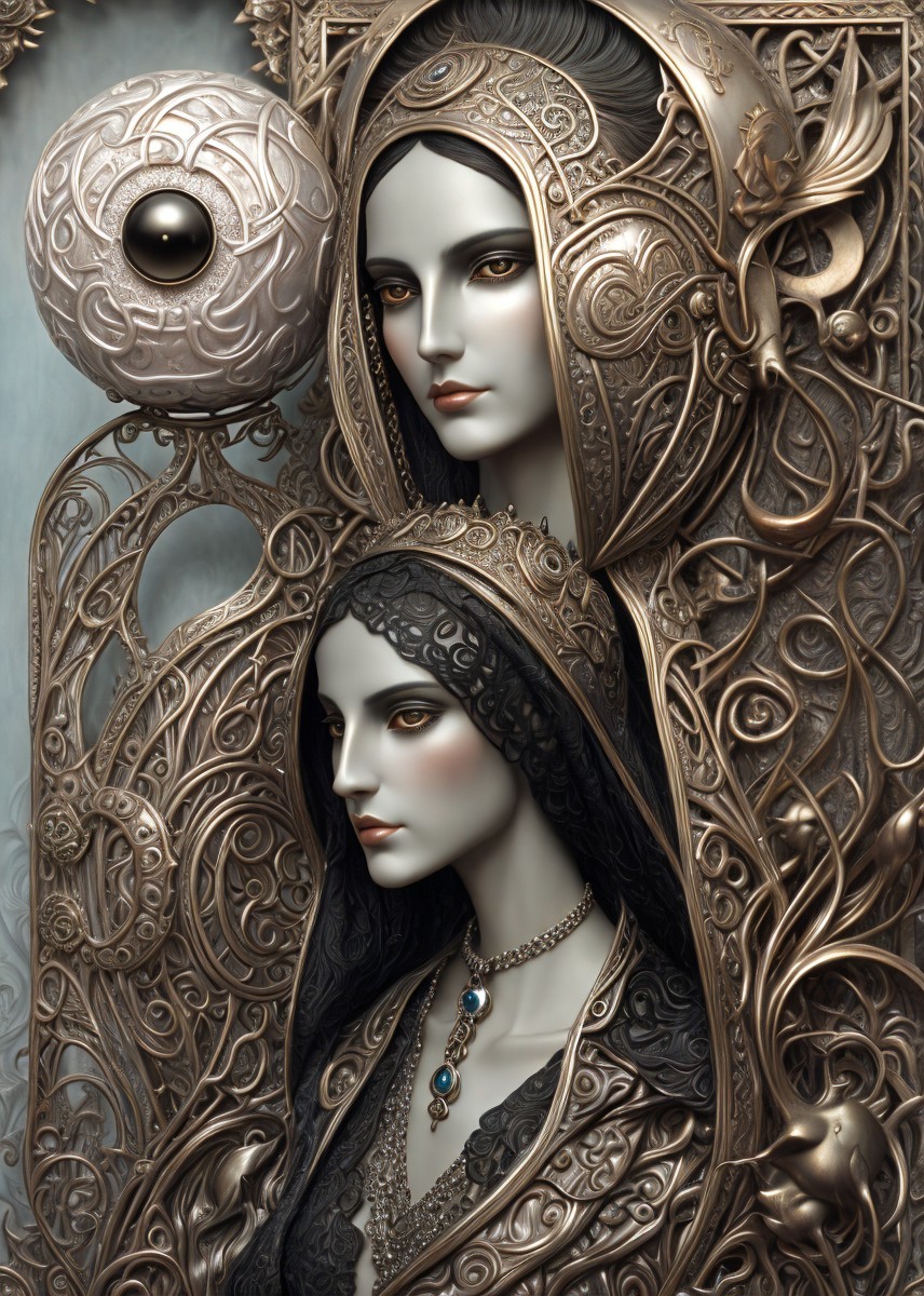 A woman with an ornate golden headdress featuring intricate filigree and a central gemstone, set against a similarly styled background.