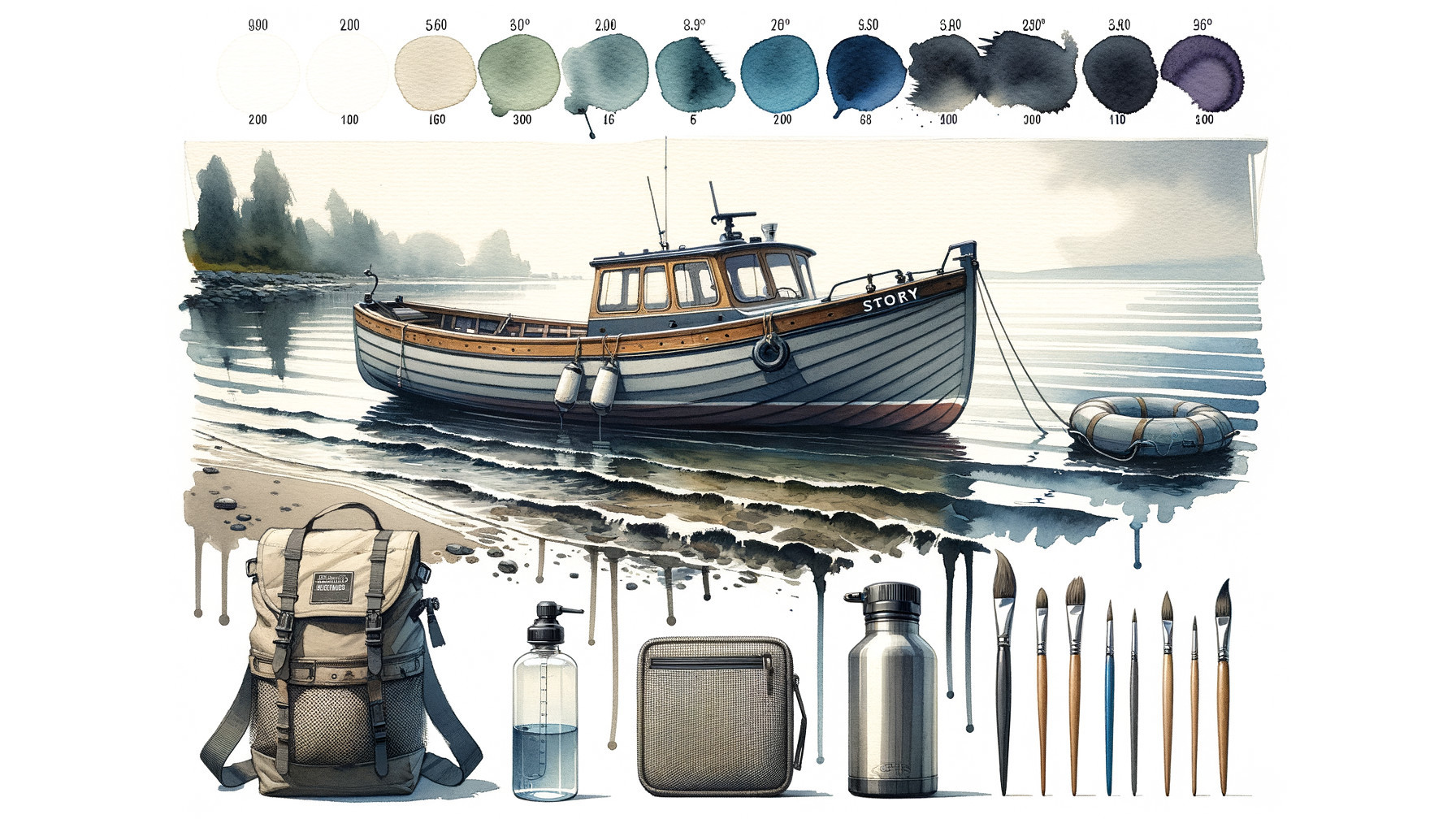 A serene watercolor scene featuring a charming boat anchored near a rocky shore. Various shades of blue and green paint swatches above complement the peaceful landscape, with art supplies included below.
