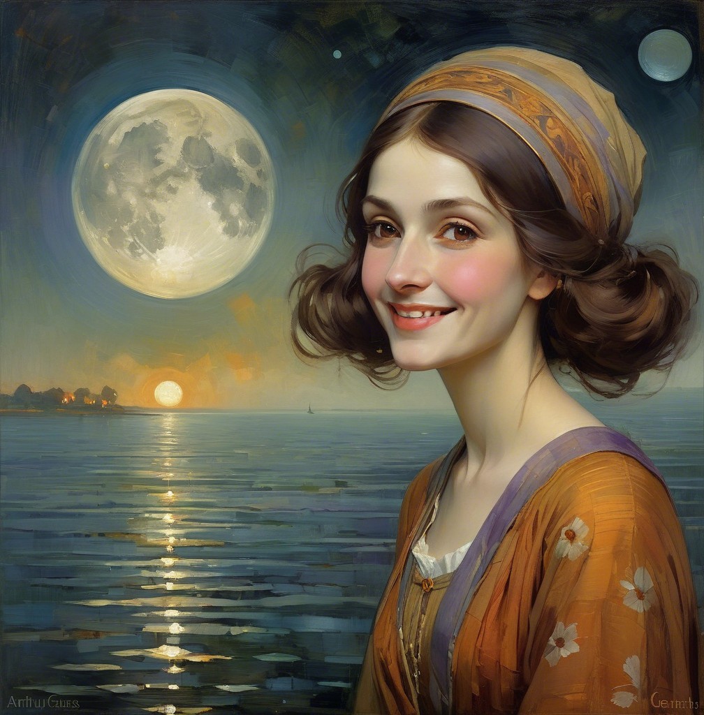 A serene scene depicting an elder woman in a flowing purple gown, gazing out at a picturesque sunset over rolling hills and flowers, framed by elegant stone arches.