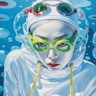 A girl with white hair and green goggles swims underwater, surrounded by colorful fish and bubbles. She wears a polka dot bikini and a white cap, creating a vibrant and playful atmosphere.