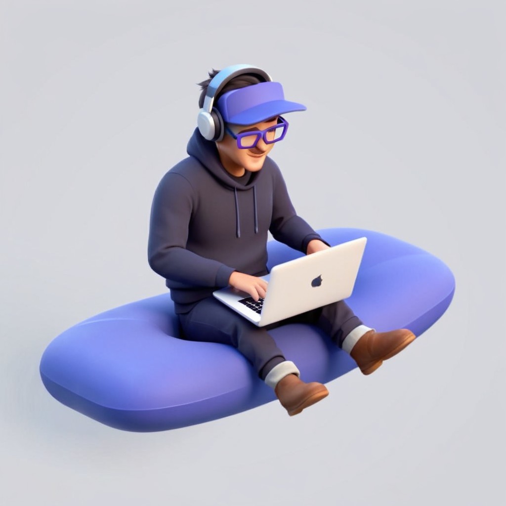 A stylized digital illustration of a bearded man wearing headphones, a blue hoodie, and glasses, sitting on an orange inflatable ring, working on a laptop.