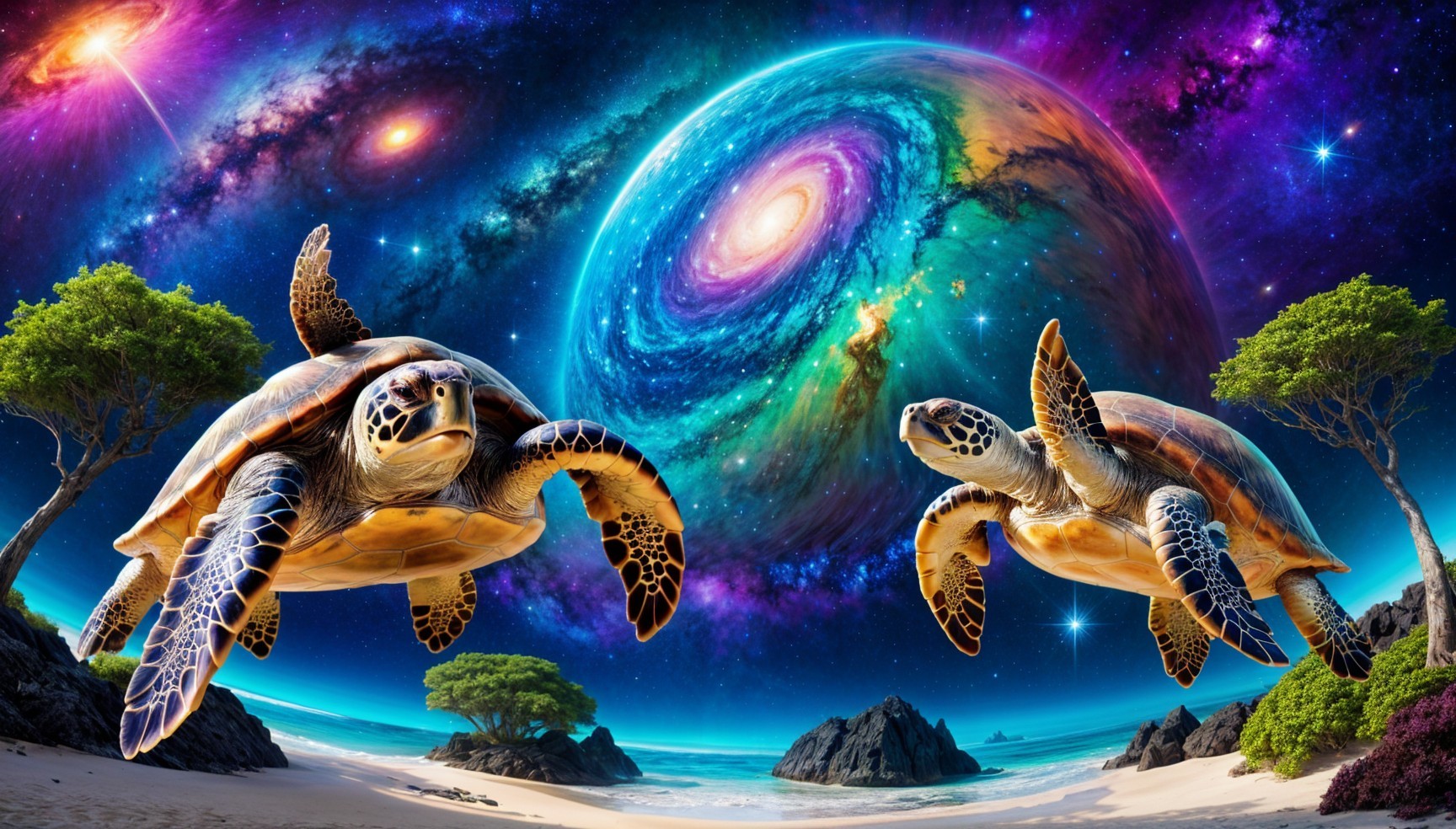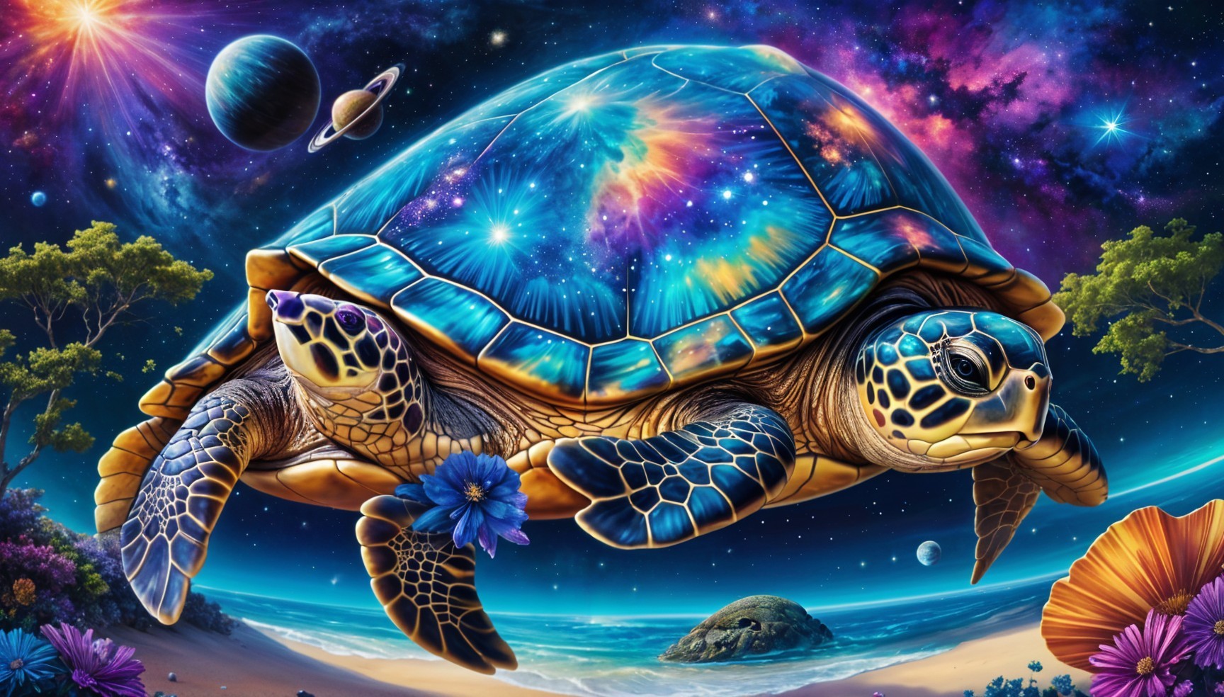A cosmic turtle swims through a vibrant galaxy filled with stars and planets. Its shell features a swirling nebula, surrounded by colorful flowers and a distant shoreline.