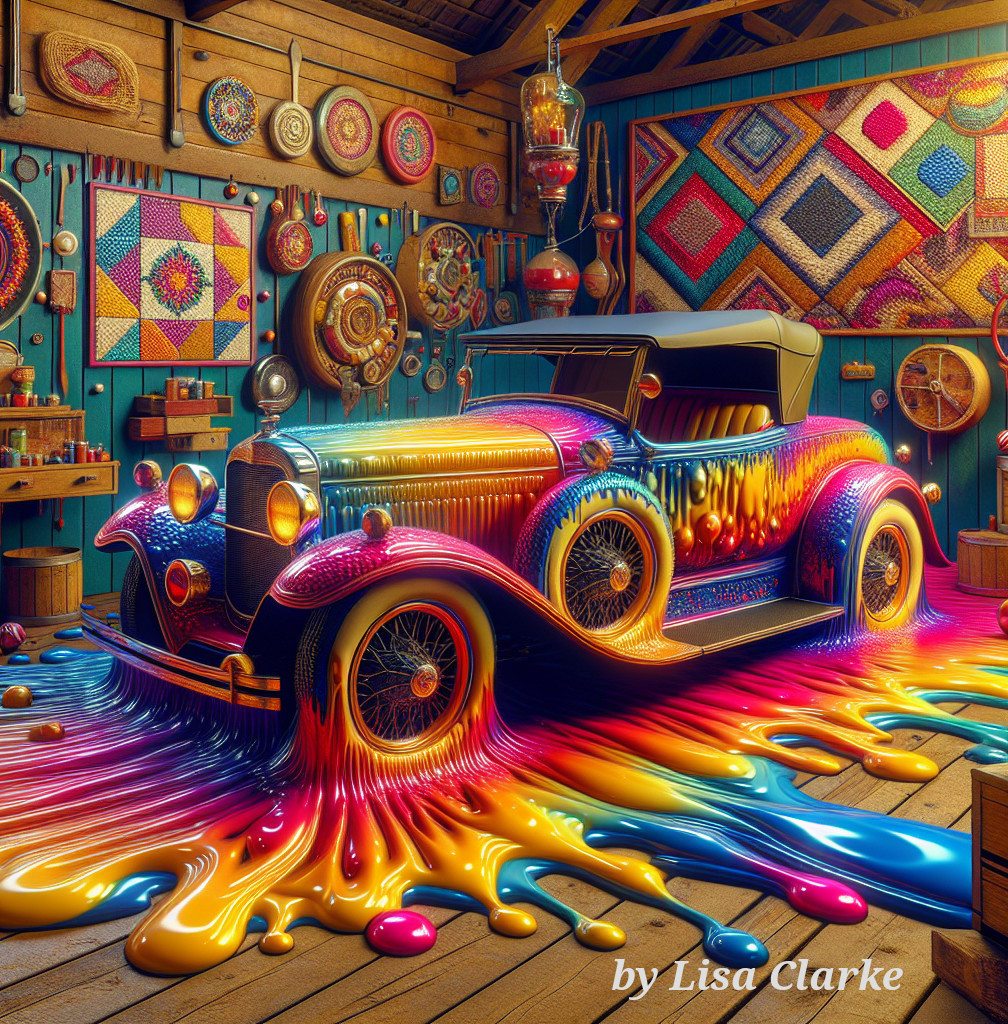 A vibrant vintage car drips with colorful paint, blending into a whimsical, artistic garage filled with eclectic decorations and handmade crafts, creating a playful, surreal atmosphere.