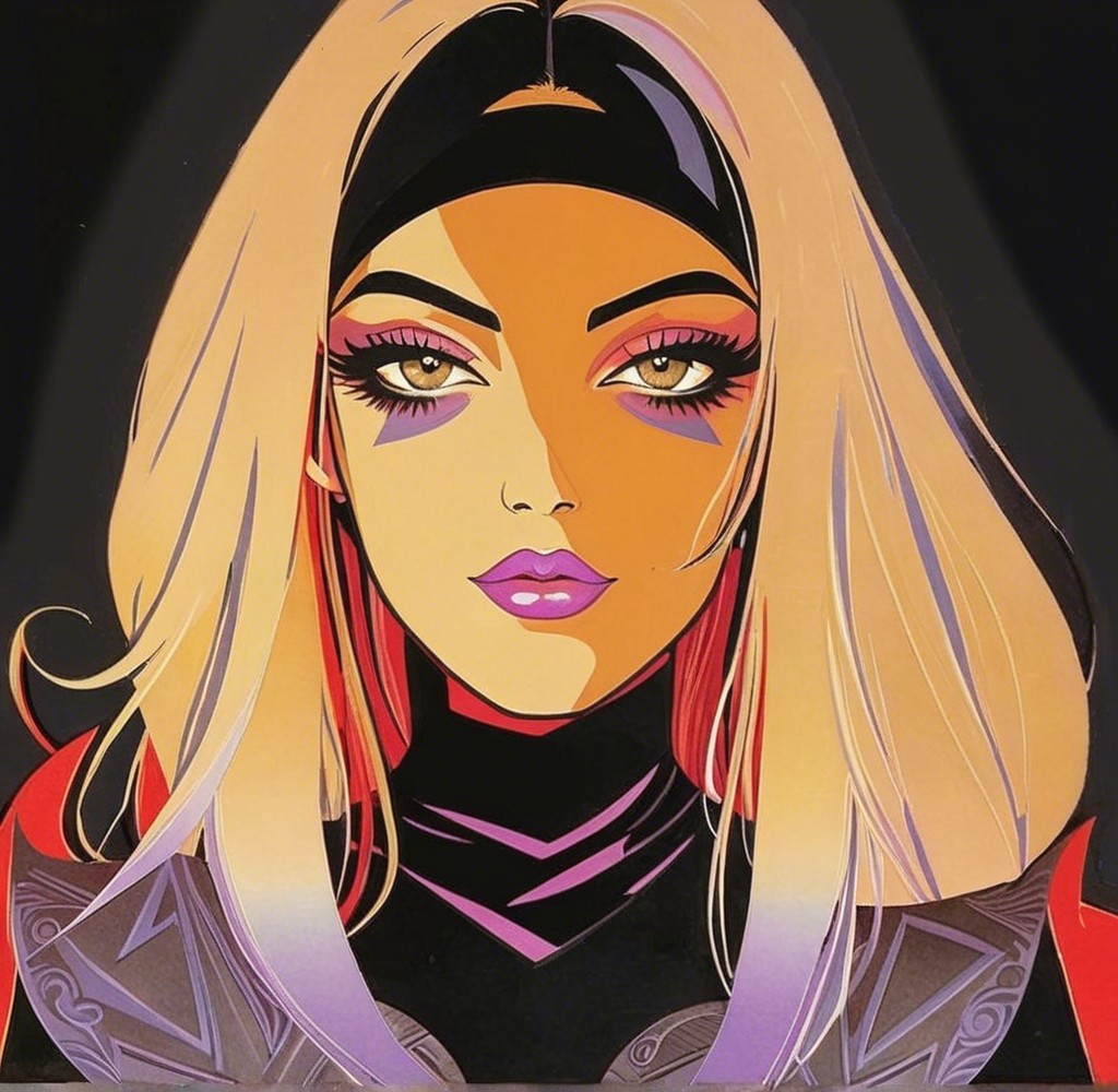 + Prompt:Stylized woodblock print, Comic book art merged with pulp art and collage illustration, reminiscent of logo design, Handsome serene temptress with devilish eyes and crystalline hair, crisp quality, Dark fantasy art, contouring lines of Dejah Thoris Style, Seductive, Sensual, patchwork, hues, mixed media, soft rounded edges, quilling, quaint, line-art hairstyle with 3D texture brushlines; zentangle patterns in black background; warm colours of orange black beige and red,.multi-layered style; cel-shaded, eroticism uhd, hdr, anisotropic filtering 1.2, raytraced shadows 1.8, hues in pale orange and soft brown, tints in style by Georgia o'keffee, Overton Loyd, Jeannette Guichard-Bunel, overall composition in space age style, stacked-up perspective, colored line drawing on black paper, hues in tiny lines, stacked lines, marvel comics art, style of Georgia O'Keefe, Jackson guice, Geof Darrow, harrison fisher, William Turner, Dee Nickerson and Margaret Keane, Art Nouveau details , traumacore 1.2, retrofuturistic details, 3d effects 1.8, ambient occlusion 1.5, raytraced shadows 1.8,