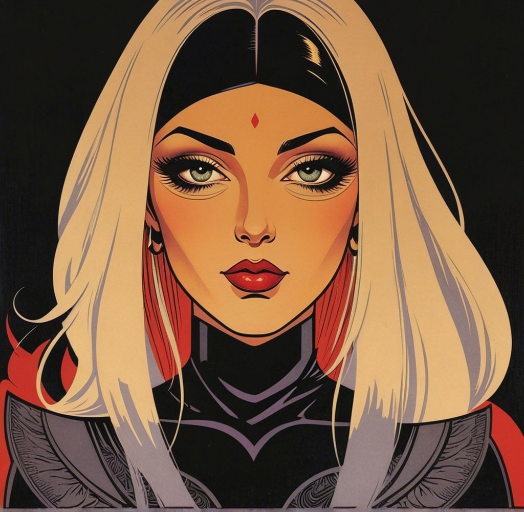Illustration of a woman with pale hair, red lips, a bindi, and a black and red outfit, exuding a strong, mystic aura.