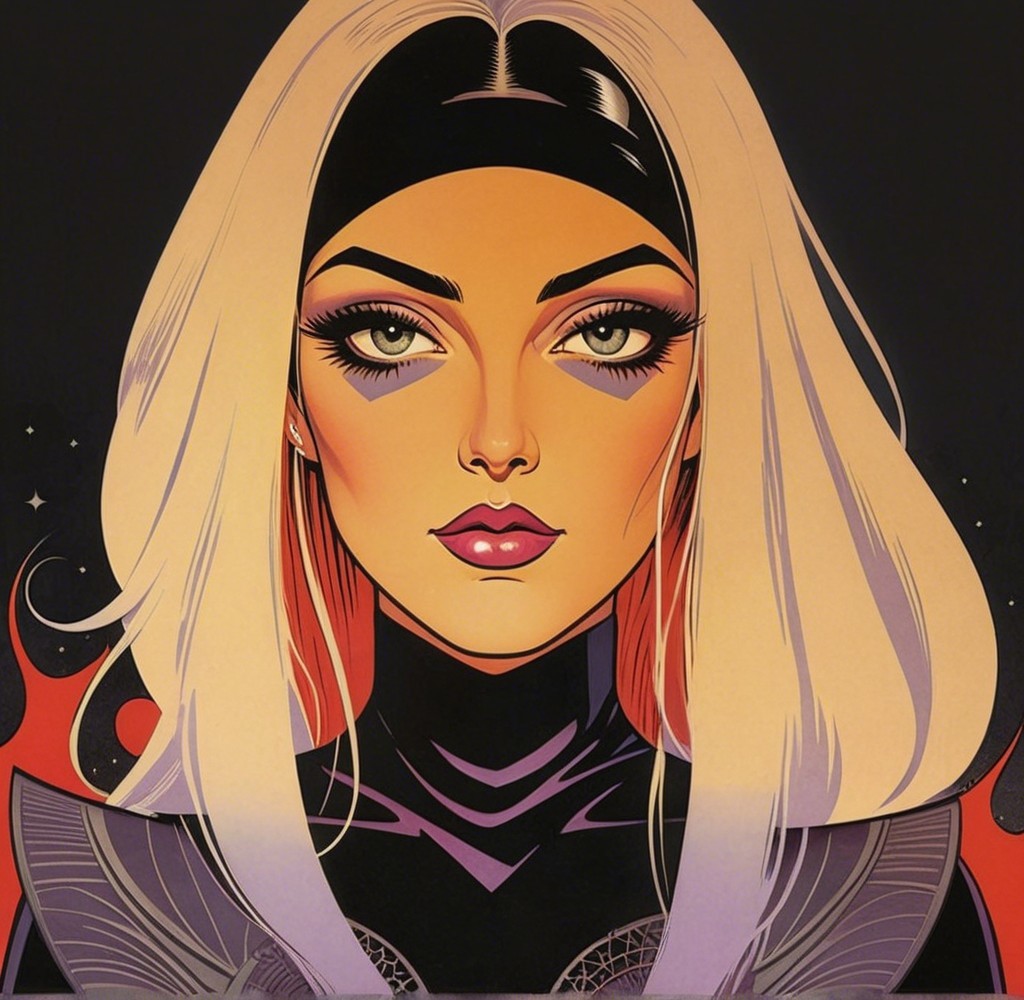 Prompt: Stylized woodblock print, Comic book art merged with pulp art and collage illustration, reminiscent of logo design, Handsome serene temptress with devilish eyes and crystalline hair, crisp quality, Dark fantasy art, Art Nouveau details, Stylized woodblock print, Comic book art merged with academical art and collage illustration, reminiscent of logo design, background shows gothical architecture, dethereal, flowing hair illusion, romantic abstraction, Dark gothic ambiance, contouring lines of Dejah Thoris and patrick nagel, 1950s advertising art,, Seductive, Sensual, eroticism, hues by Overton Loyd, line-art hairstyle with 3D texture brushlines; zentangle patterns, warm colours of grey black beige and red,.multi-layered style; cel-shaded, uhd, hdr, hues in pale pink and soft beige, tints in style by Georgia o'keffee, Overton Loyd, Kate greenaway, Paul Cadden', overall composition in space age style by Curtis Cole, stacked-up perspective, detailed line drawing on old paper, hues in tiny lines, stacked lines, marvel comics art by John buscema, barclay shaw, harrison fisher, Margaret Keane, William Turner, Patrick Nagel and Overton Loyd, steampunk details by barclay shaw, fauvistic, bold lineage illustration, wide angle, grain, metallic details in lineage in black ink, fancy, moody, stylized background in style of collage illustration merged with abstract art, stylized lighting from top to centre, divisionism, acetate, anisotropic filtering 1.7, shadow mapping1.73, radiance, plasticity 1.3, beautiful marvel comic book character, pink to beige color palette, close-up, 3 layers of dof, traumacore 1.1, octane render illustration,, comic book art, overall stylized illustration by Barclay shaw and Overton Lloyd, plasticity 1.3, octane render, uhd, hdr, high coloring, brightness 1.9, ambient occlusion 1.5,raytraced shadows 1.8, divisionism, quilling, delicate coloring