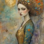 A serene portrait of a woman with flowing hair and a gentle expression, surrounded by vibrant autumn foliage and flowing shapes, evoking a sense of harmony with nature and tranquility.