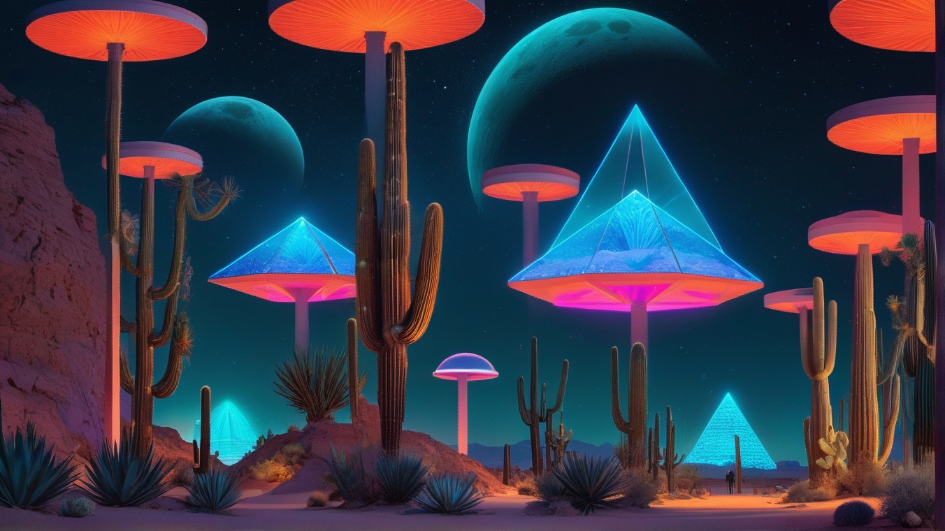 A surreal desert landscape at night with glowing, levitating pyramids, cacti, and vibrant orange foliage under a starry sky.