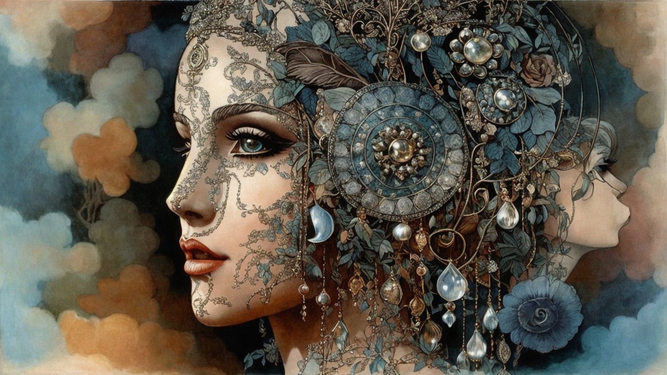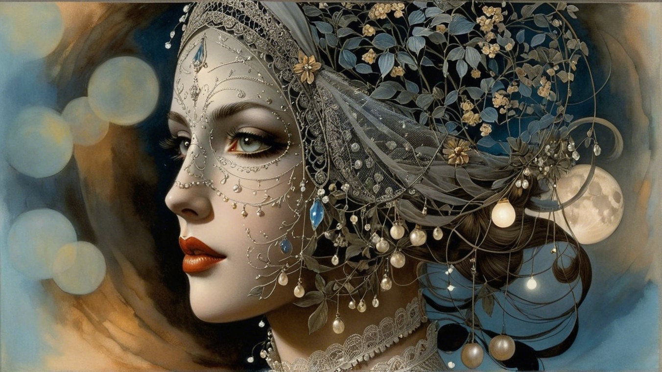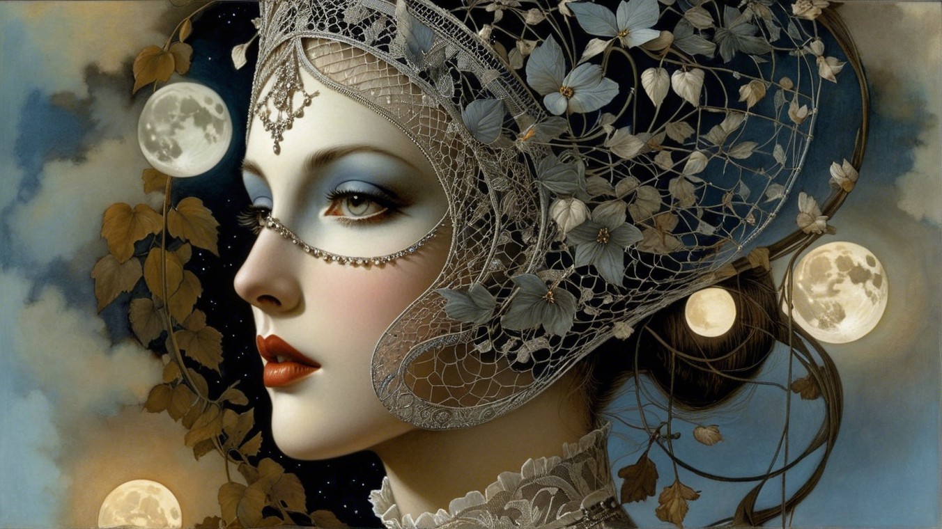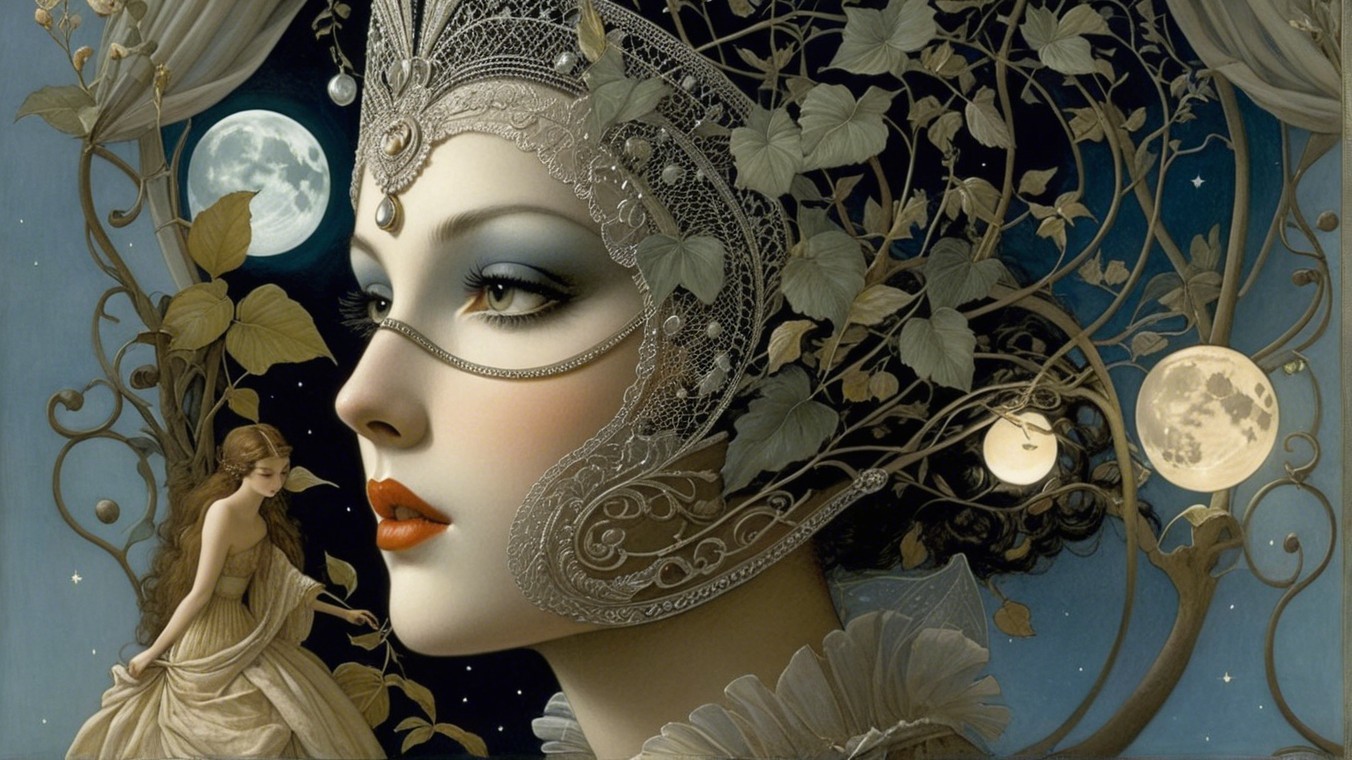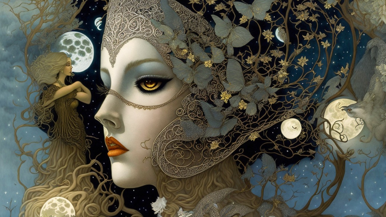 A serene woman with striking features wears an ornate headdress adorned with foliage. The night sky, lit by a full moon and glowing orbs, adds a mystical atmosphere to the scene.