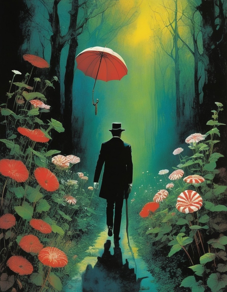 A silhouetted person with a red umbrella walks down a forest path, surrounded by flowers, bathed in a mystical yellow glow.