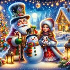 A festive winter scene featuring a jolly Santa and a cheerful girl with a snowman. They’re surrounded by twinkling lights, a decorated tree, and a cozy cottage amid the snowy landscape.