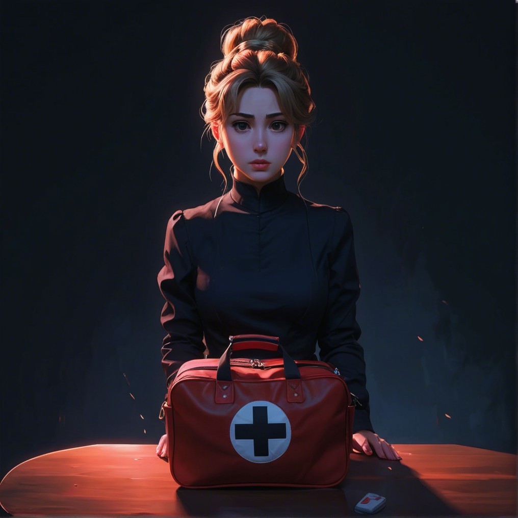 A poised female figure with long hair stands before a table, wearing a dark uniform adorned with a red cross. A red medical bag rests in front of her, set against a dramatic dark background.