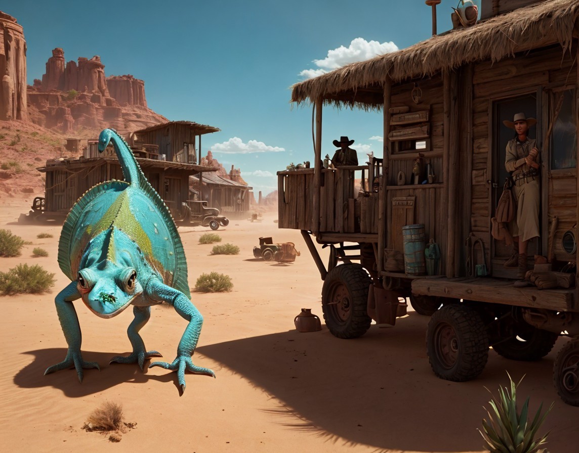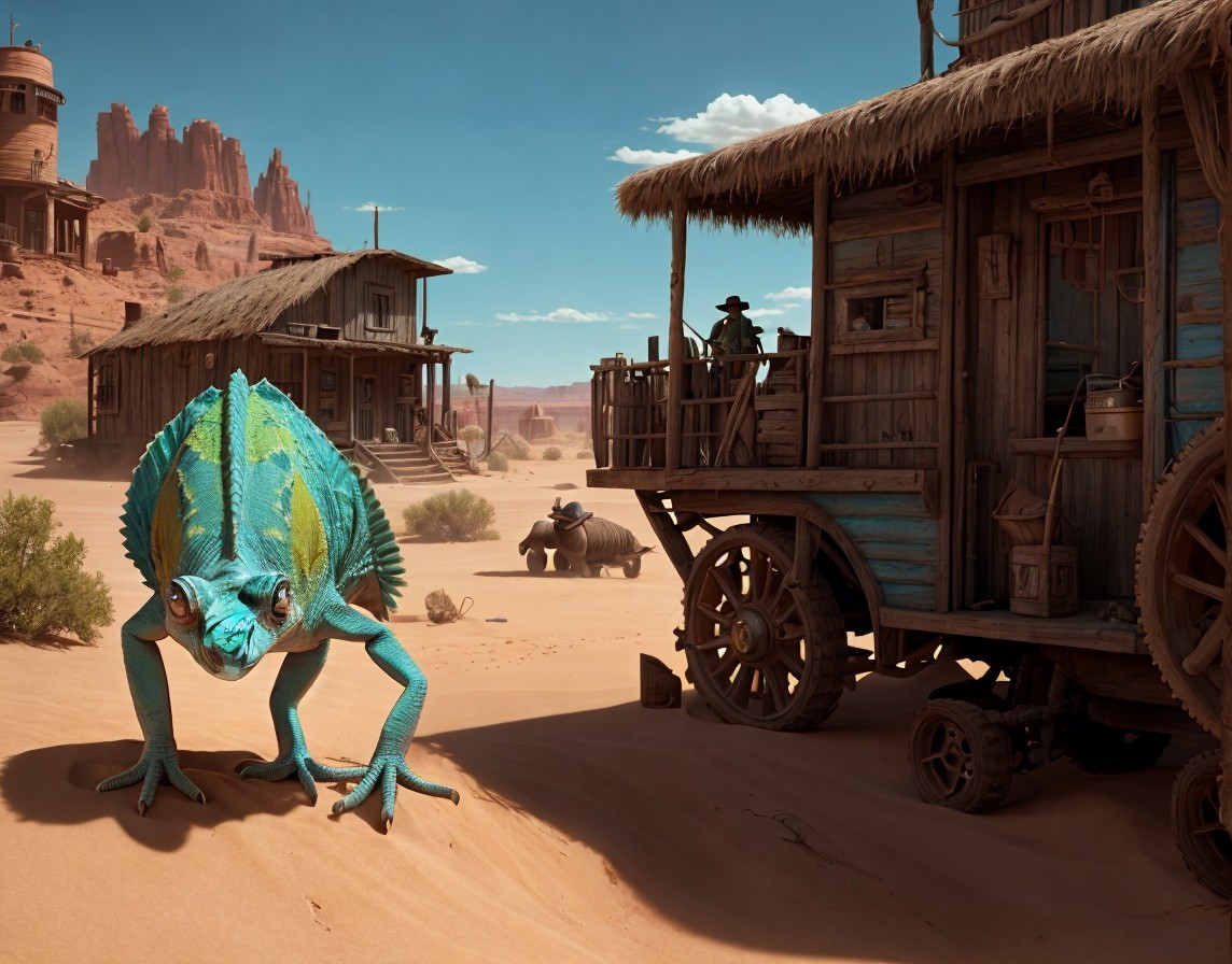 A colorful alien creature stands by a wooden shack in a desert with cowboys, vehicles, and rocky formations in the background.