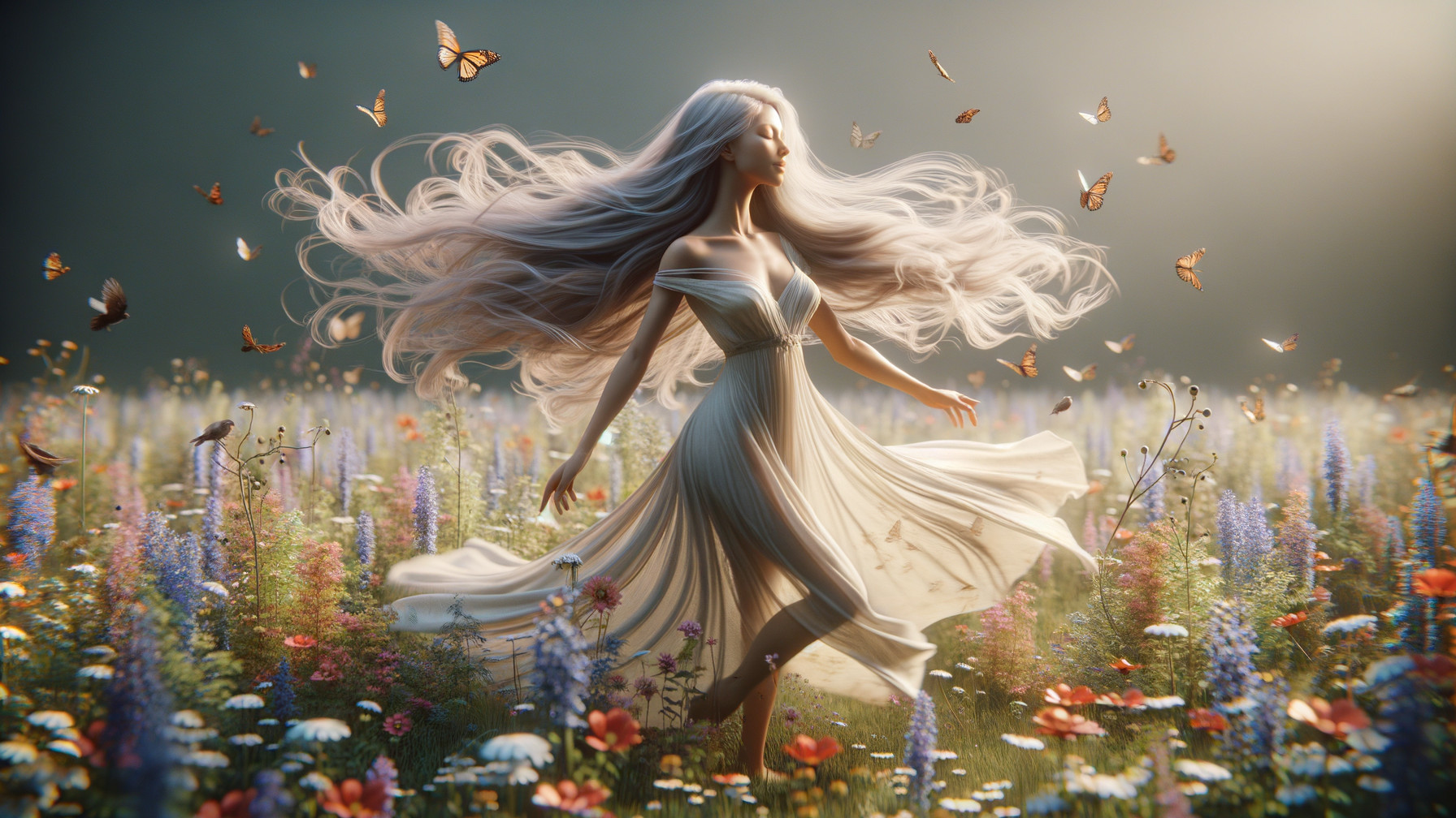 A young woman with long, flowing white hair strolls through a vibrant field of blooming flowers, wearing a delicate, light dress. The scene is serene, filled with soft colors and natural beauty.