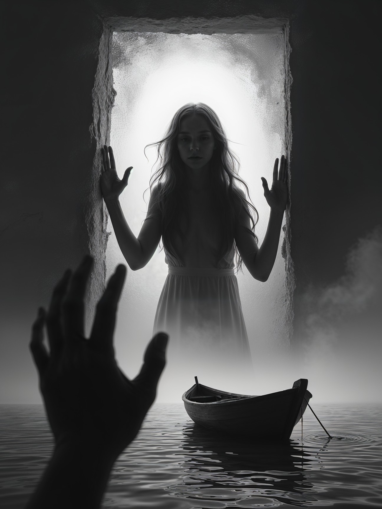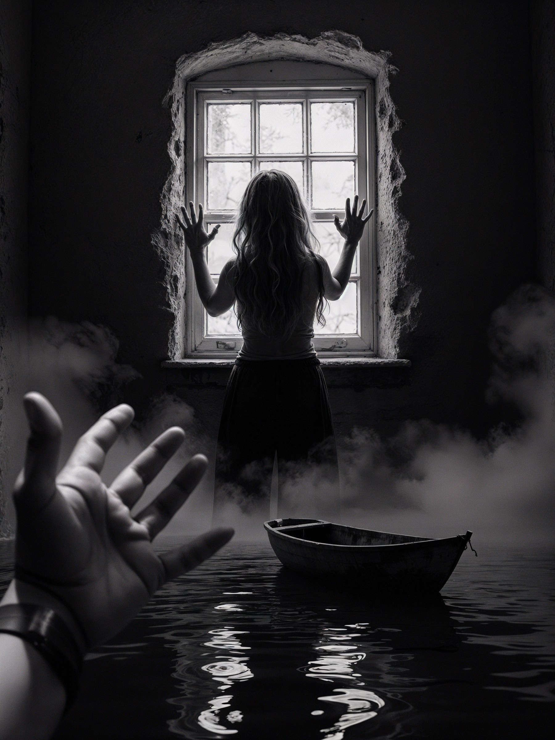 Prompt: "Create a black and white image that conveys a sense of isolation and longing. The scene features a textured, swirling background that gives the impression of a tunnel or vortex, leading to a central window. Through the window, the silhouette of a woman can be seen, pressing her hands against the glass, appearing distressed or yearning. She has long, flowing hair, and her body is slightly turned as if reaching out. In the foreground, a hand emerges from the left side of the image, its fingers splayed, creating a stark contrast against the dark backdrop. Below, a small, weathered boat floats on a serene yet ominous body of water, hinting at themes of abandonment and vulnerability. The overall atmosphere is haunting and evocative, capturing a moment of deep emotion."