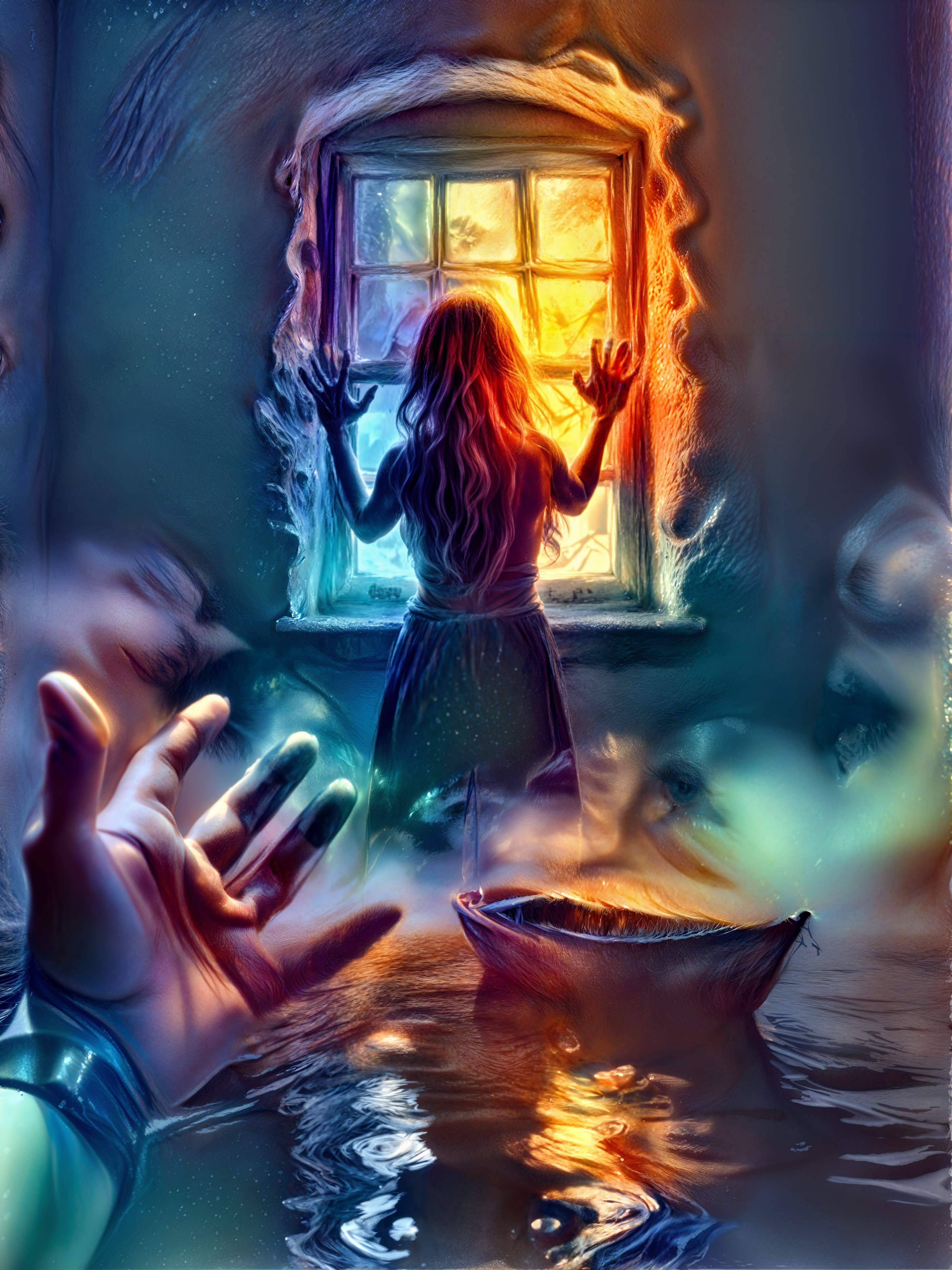 Her arms are raised, with hands pressed against the glass, as if reaching out for something beyond the window. The background is slightly blurred, enhancing the mysterious atmosphere, with soft, ghostly faces subtly emerging in the shadows.