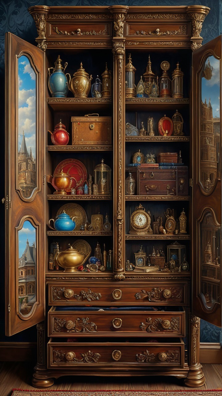 A beautifully crafted wooden cabinet showcases an array of vintage items, including ornate bottles, leather bags, and intricate clocks, all amidst a backdrop of scenic architecture.