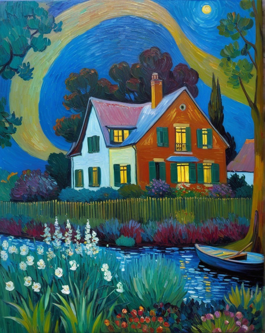 A vibrant, swirling night sky surrounds a charming house by a river. The scene features bold colors with illuminated windows, lush greenery, and blooming flowers, creating a lively, whimsical atmosphere.
