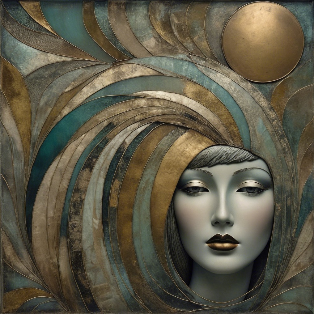 , nostalgia, glory, Mercury Glass patina, light and gossamer haze, topographic lines, Art Brut, moody, somber, desaturated colors. In the style of John Rogers cox . This artwork amalgamates the artistic styles of Michael Parkes,
