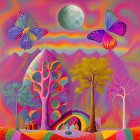 A vibrant, psychedelic landscape features a colorful skull wearing stylish sunglasses, surrounded by playful, brightly colored flowers, creating an eye-catching and surreal atmosphere.