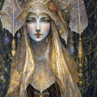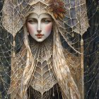 A serene figure with long, flowing hair wears a delicate veil adorned with intricate spiderwebs. Soft light glows from beneath the veil, creating a mystical and enchanting atmosphere.