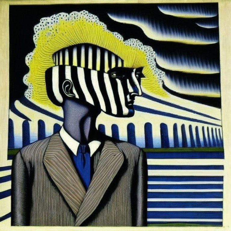 Abstract portrait with patterned face and striped surroundings in suit and tie against wavy backdrop