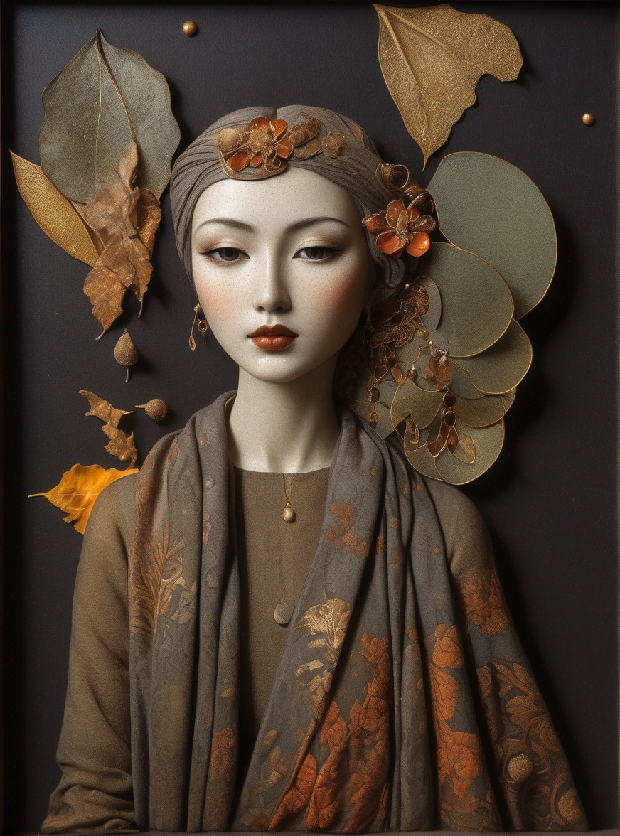 An elegant woman with flowing hair and ornate clothing is depicted in a classical style, adorned with golden accents.