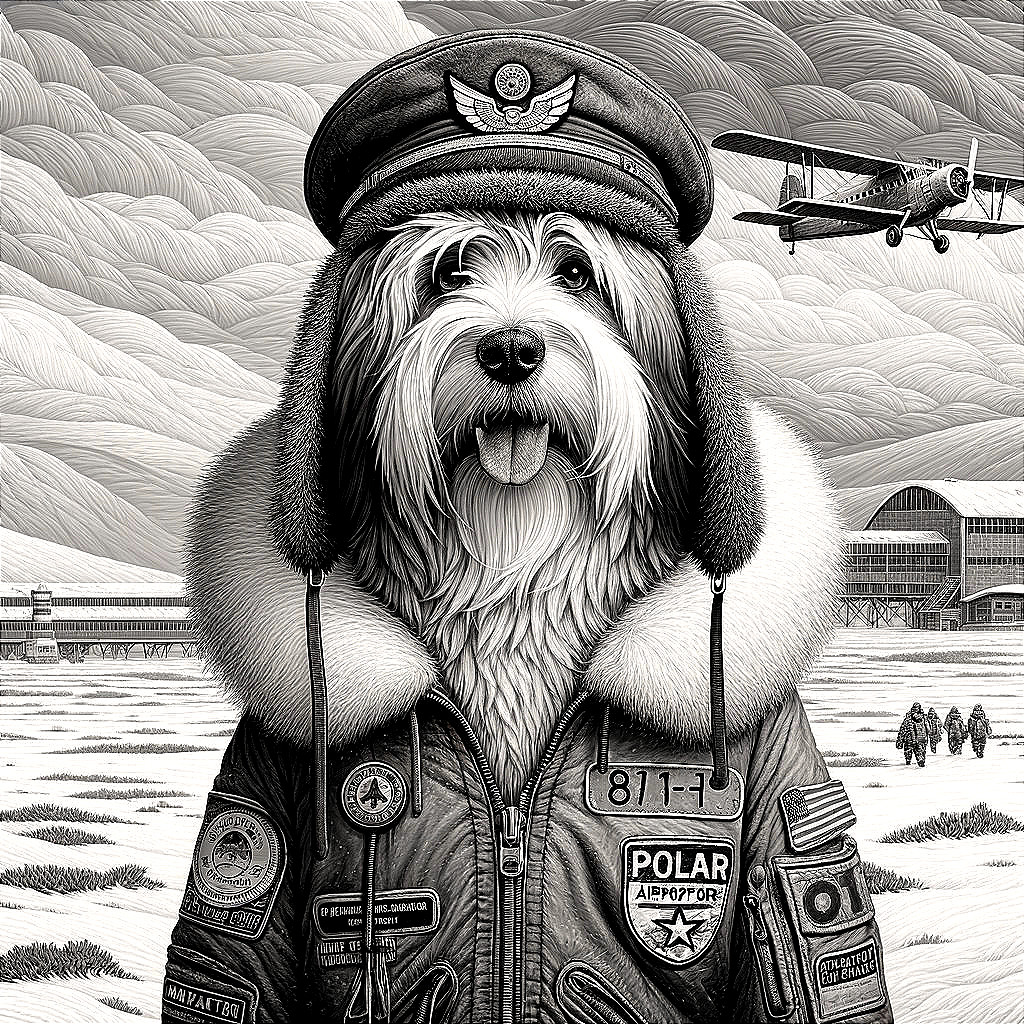 A detailed illustration of a dog dressed as a pilot with patches, a cap, and headphones in front of a vintage airplane and hangar.
