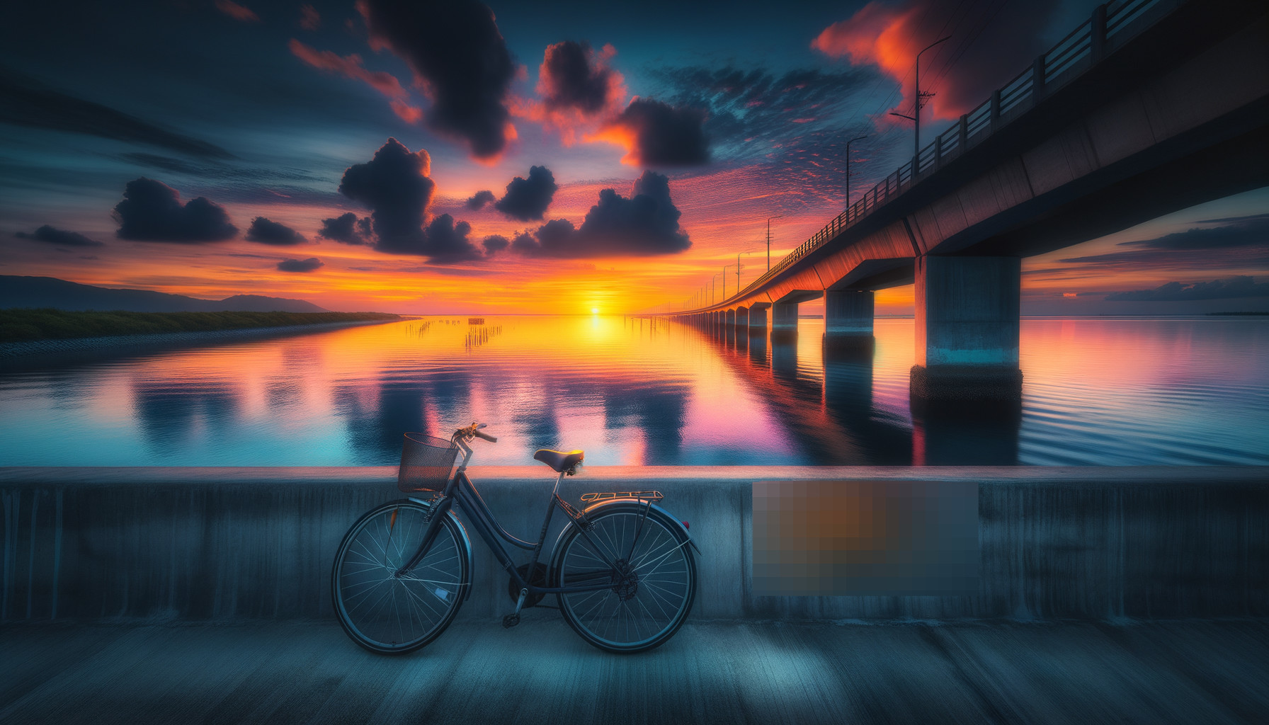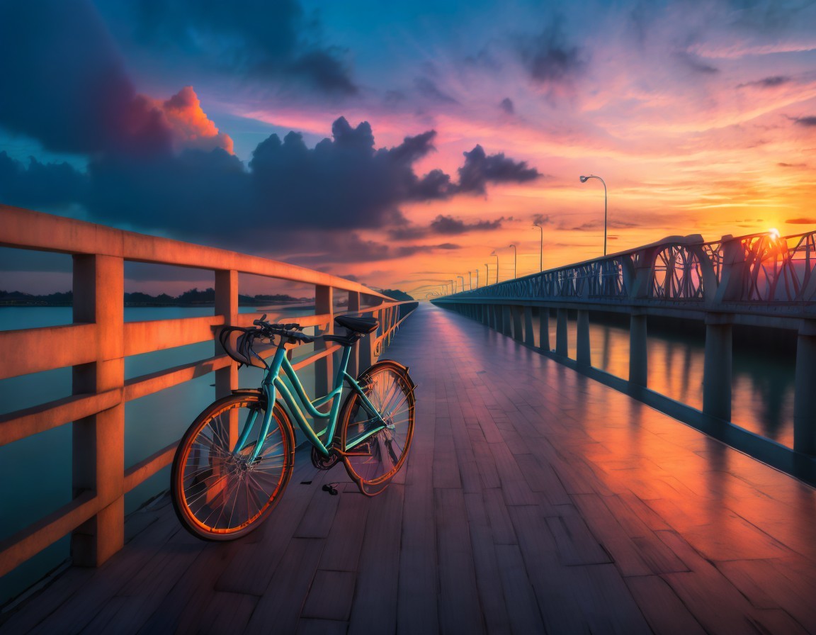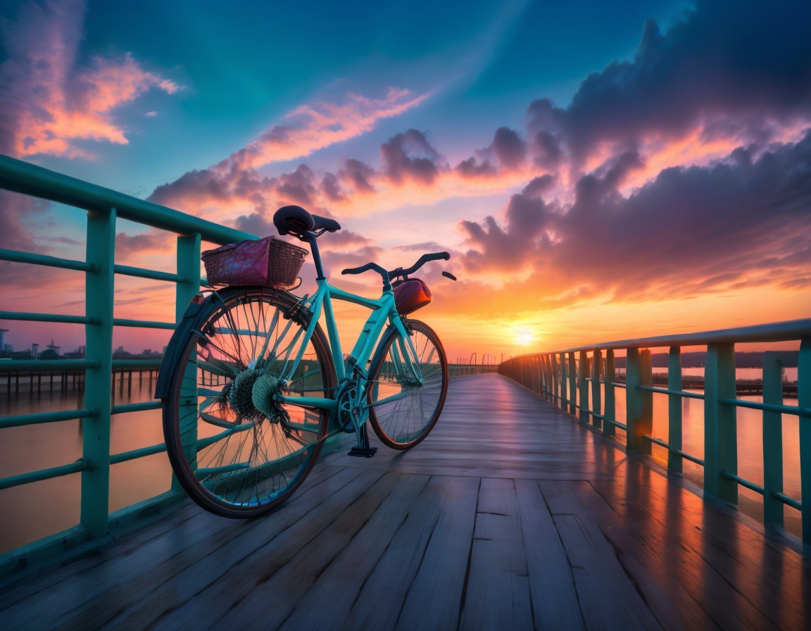 Bicycle on Wooden Pier at Vibrant Sunset Over Sea