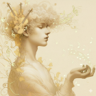 A graceful figure with intricate golden sunburst headpiece poses against a softly detailed background. She holds a delicate fan, exuding elegance and symbolism of light and femininity.