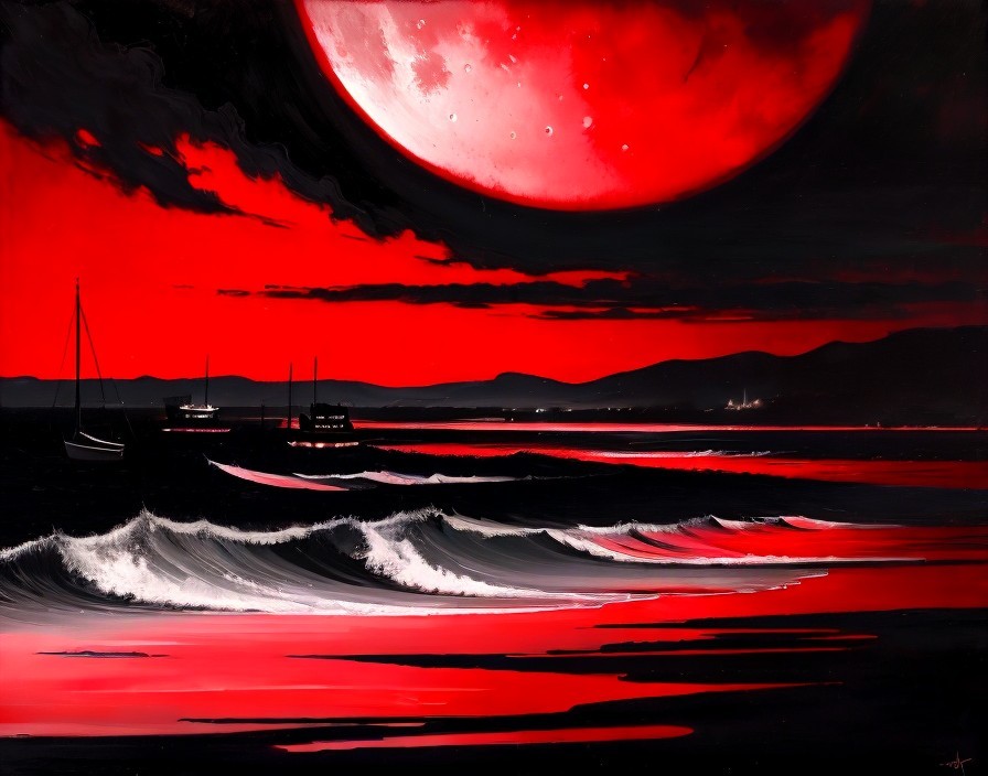 Prompt: An atmospheric impressionist and noir painting using liquid oil textures of black and red, showcasing a moonlit waterfront scene with docked noir-era boats, their silhouettes cast against the rippling waves in a haunting crimson hue.