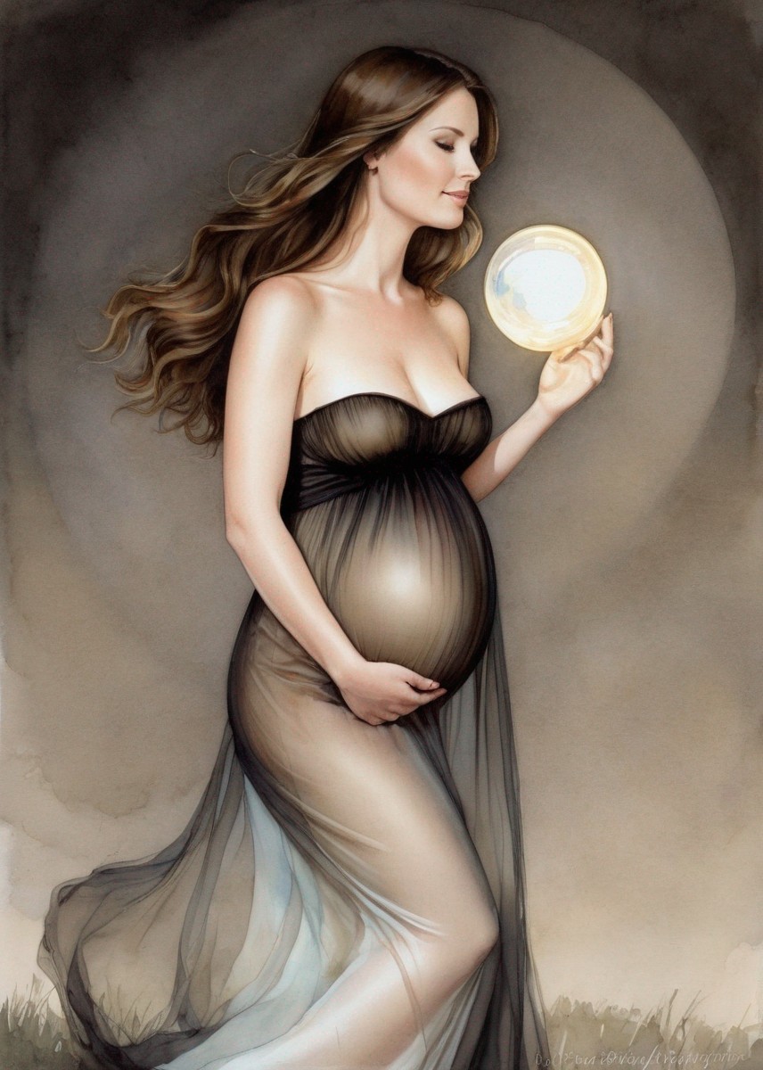 An illustration of a serene pregnant woman in a flowing dress, cradling her belly, with a glowing orb and a crescent moon behind her.