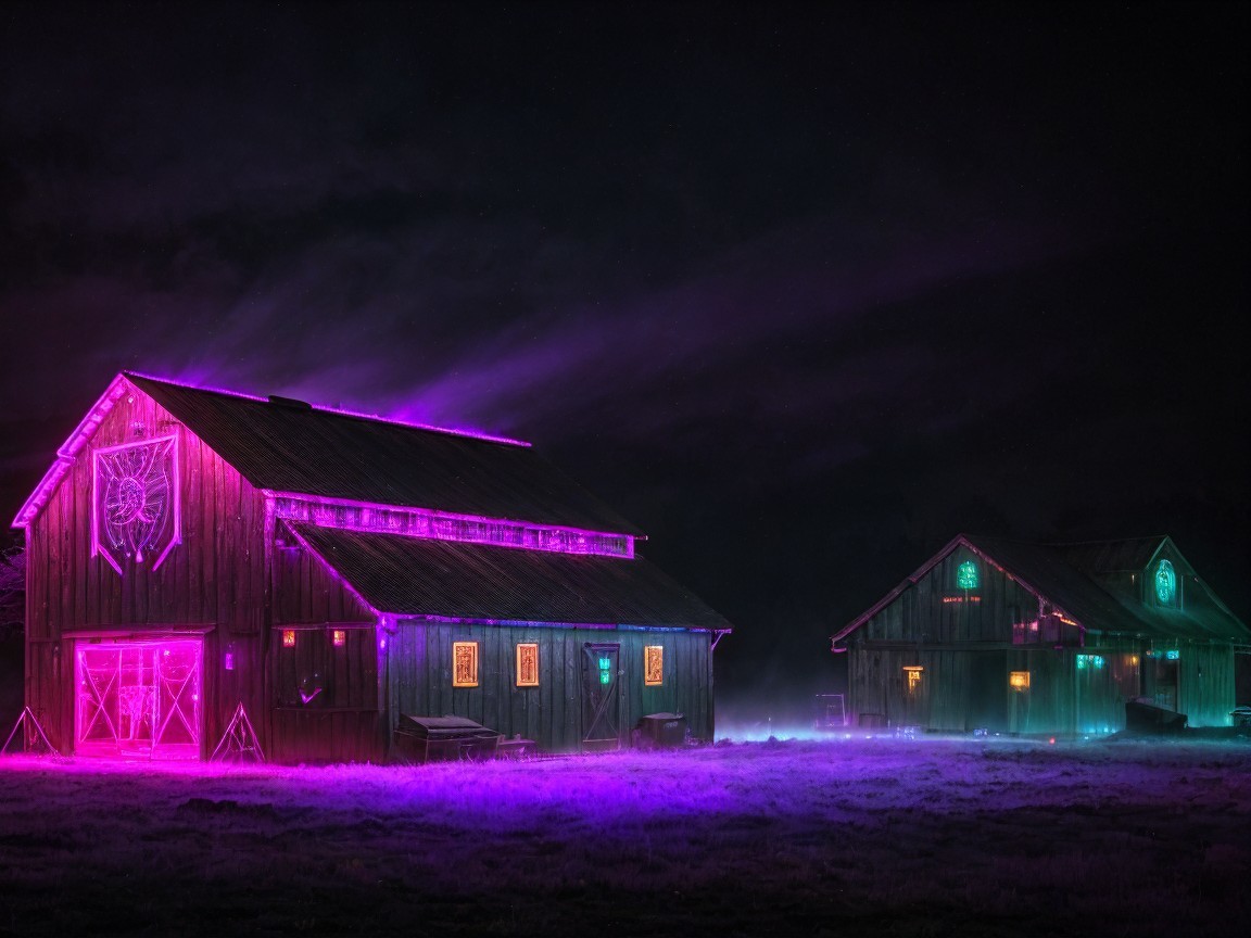 A vibrant nighttime scene features two rustic barns illuminated with neon pink and blue lights, casting a colorful glow over the surrounding tall grass in a tranquil rural setting.
