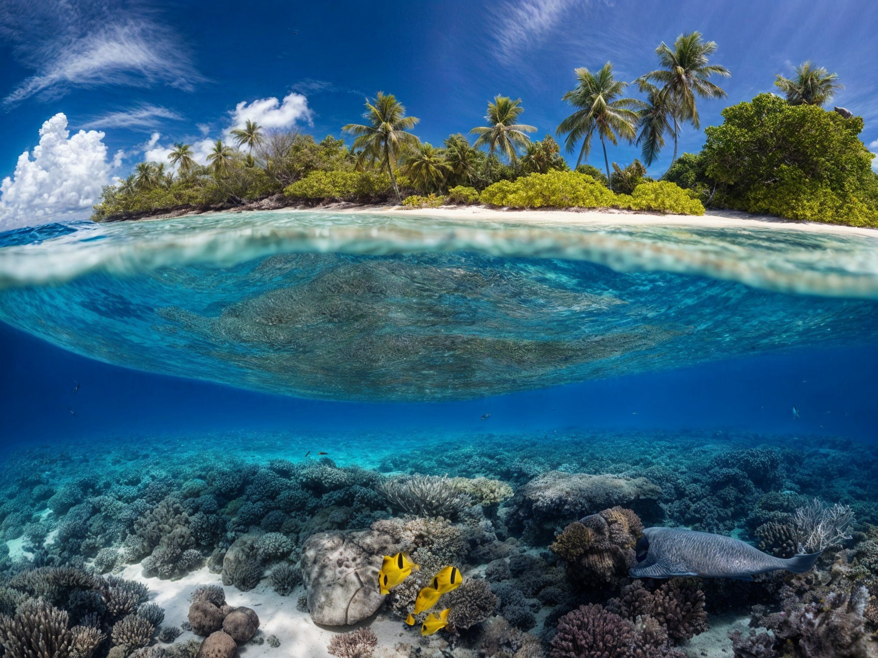 Vibrant underwater scene showcasing colorful coral reefs and schools of yellow fish beneath a clear blue sky. Lush palm trees frame the idyllic beach in the background. A serene paradise.