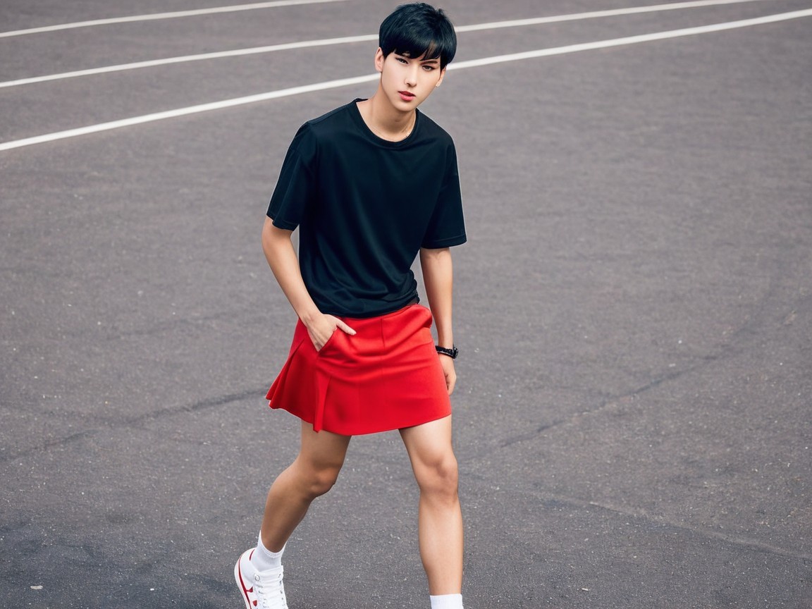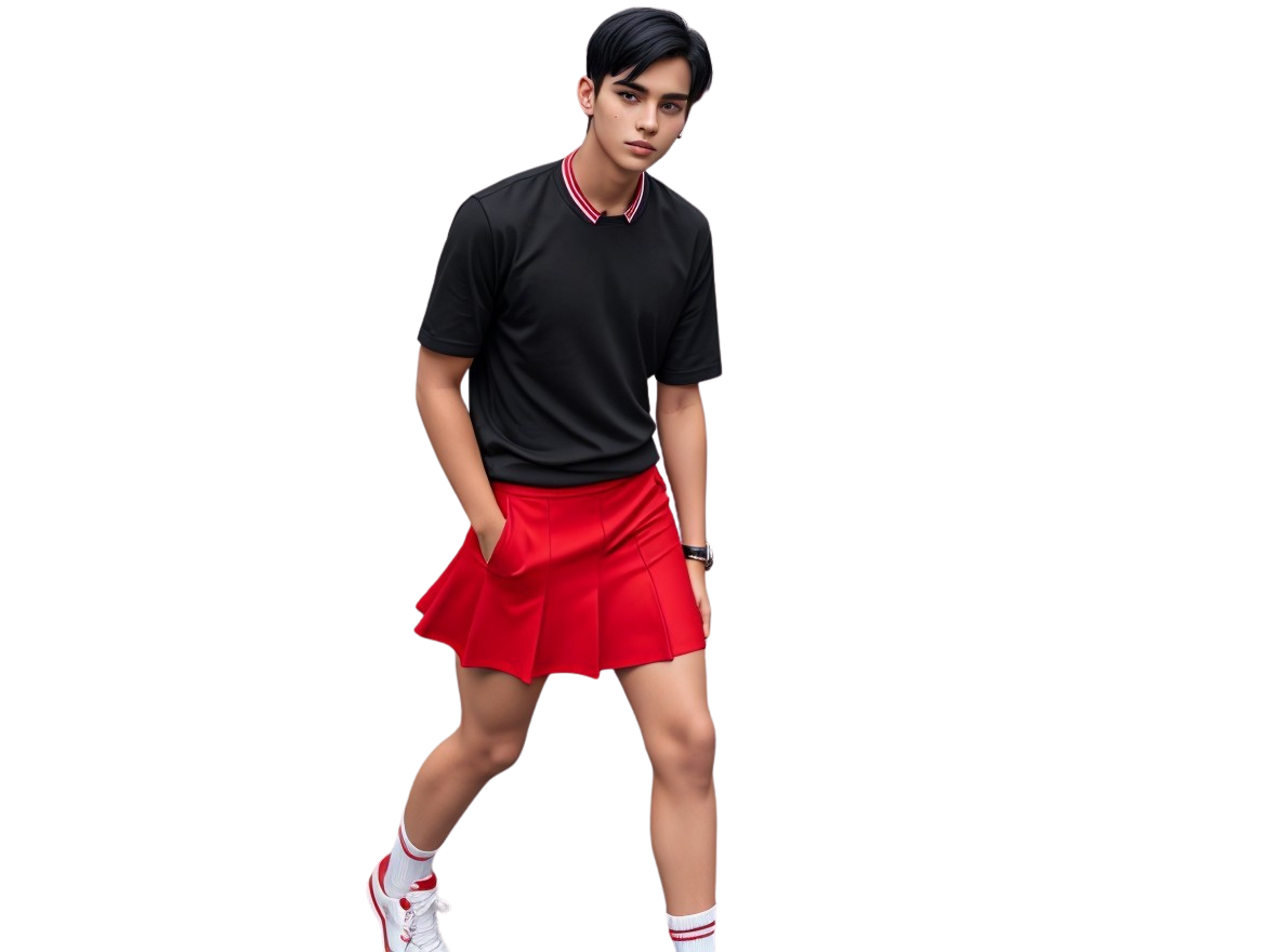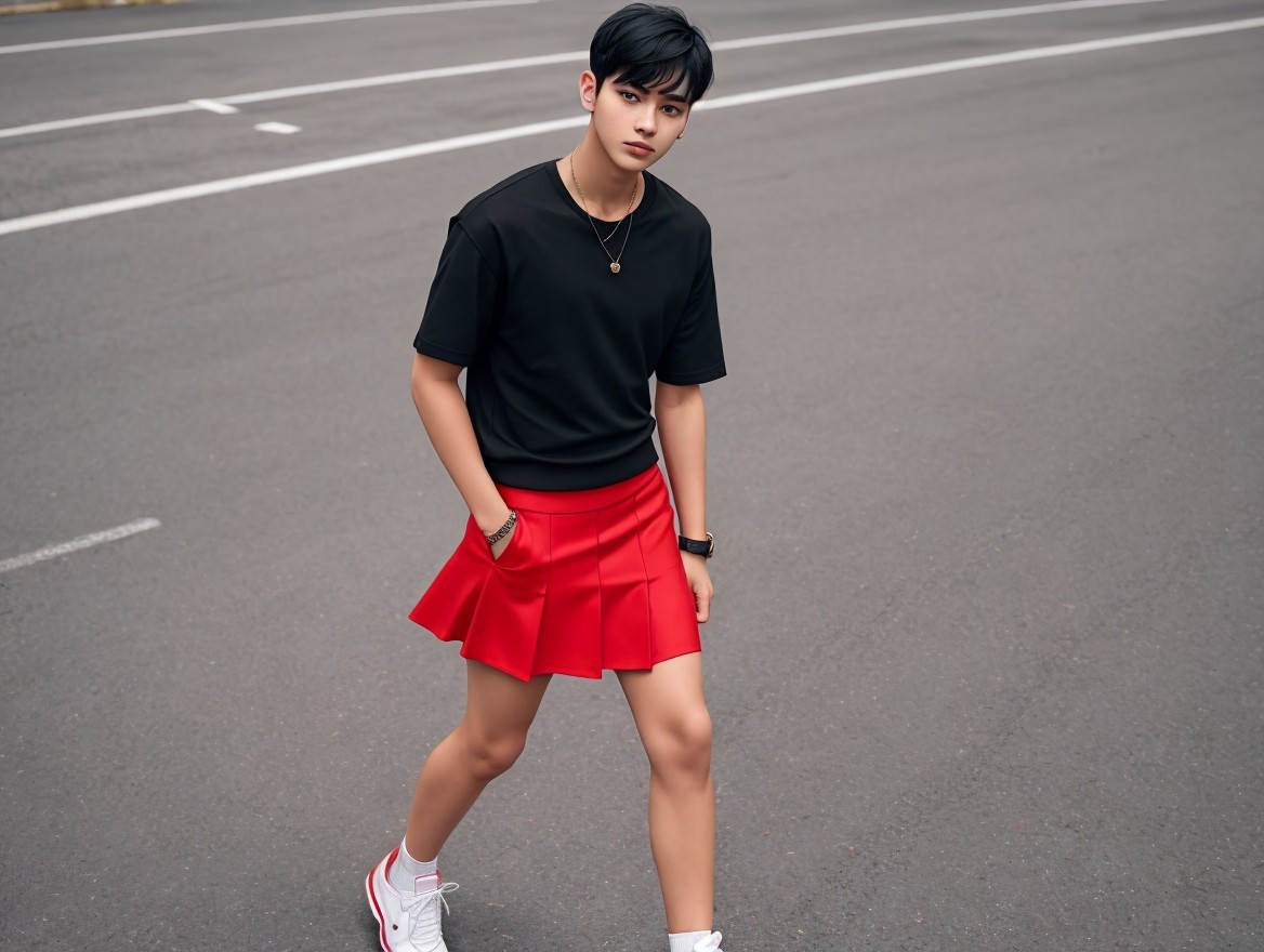 A young man walks confidently down the street, wearing a black t-shirt and a vibrant red skirt, exuding a bold, modern vibe.
