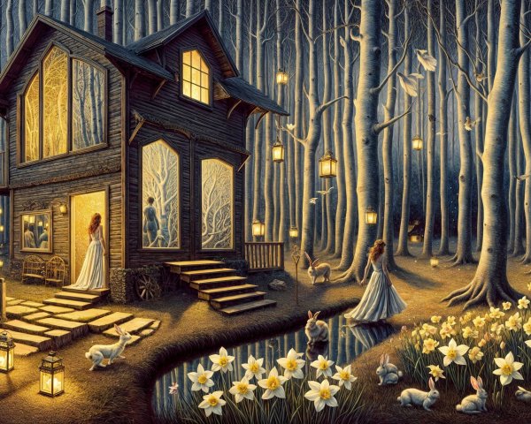 A serene young girl with golden hair adorned with flowers and peaches stands before a dreamy castle backdrop. Her delicate features and soft pastel attire create an enchanting, fairytale atmosphere.