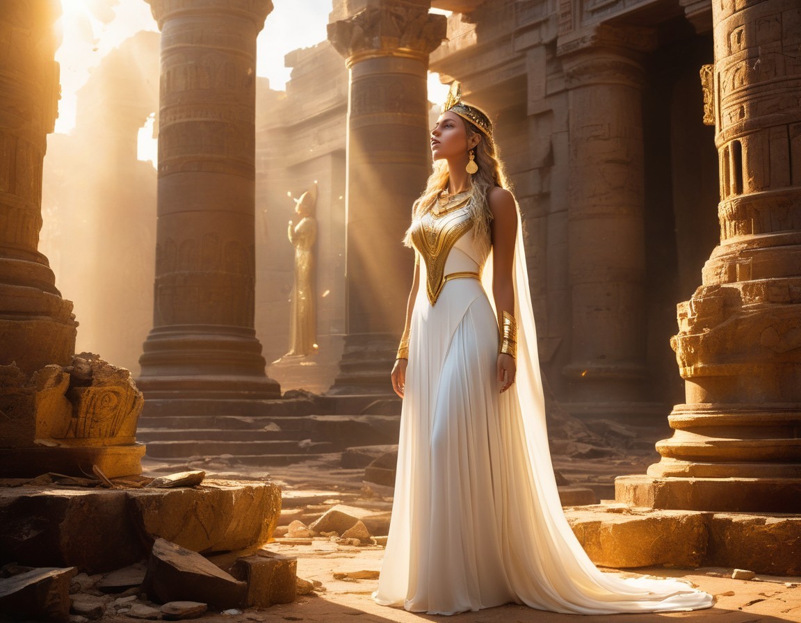 Prompt: high priestess stands in the middle of a destroyed temple inside the great lost city of Atlantis. she is channeling a pillar of golden light from the heavens in to the earth. wearing a plain white flowing dress. She is healing the earth with her magnificent heart and powerful light. She is powerful, fierce, full of beauty and grace, She will win this battle between the darkness and the light. photo realistic face, high definition, intricate details 8k