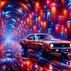 A vibrant orange classic muscle car stands gleaming on a rain-soaked street, reflecting colorful neon lights from nearby buildings, creating a striking, nostalgic atmosphere.