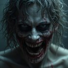 A sinister figure with wild, curly hair displays a grotesque face, featuring dark, exaggerated makeup and a menacing grin full of sharp teeth. The eerie atmosphere enhances the chilling expression.
