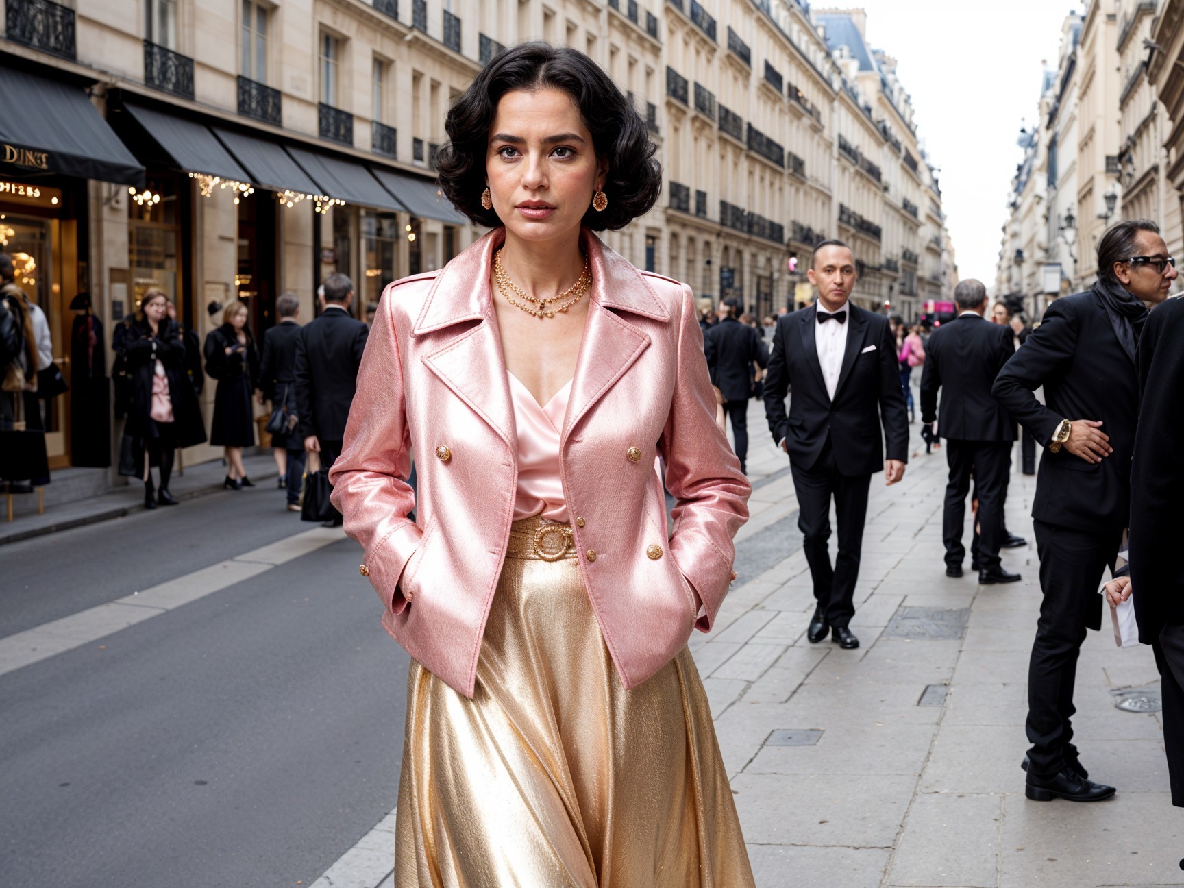 A stylish woman in a pink satin blazer and gold skirt stands confidently on a bustling Parisian street, surrounded by elegantly dressed individuals. The scene exudes glamour and sophistication.