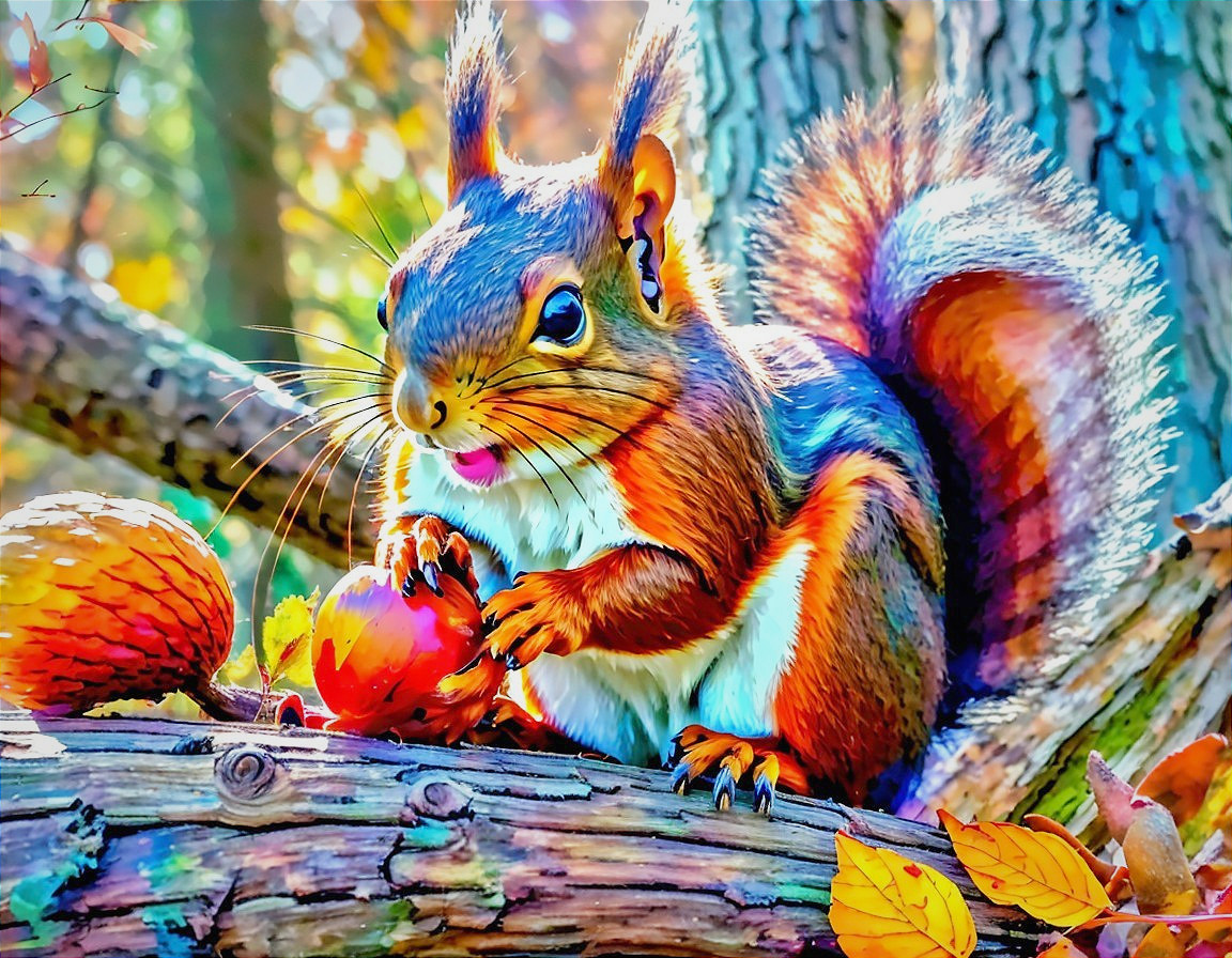 A vibrant squirrel sits on a tree branch, holding an acorn. Its fur glistens in the sunlight, surrounded by autumn leaves and pinecones, showcasing a colorful forest backdrop.